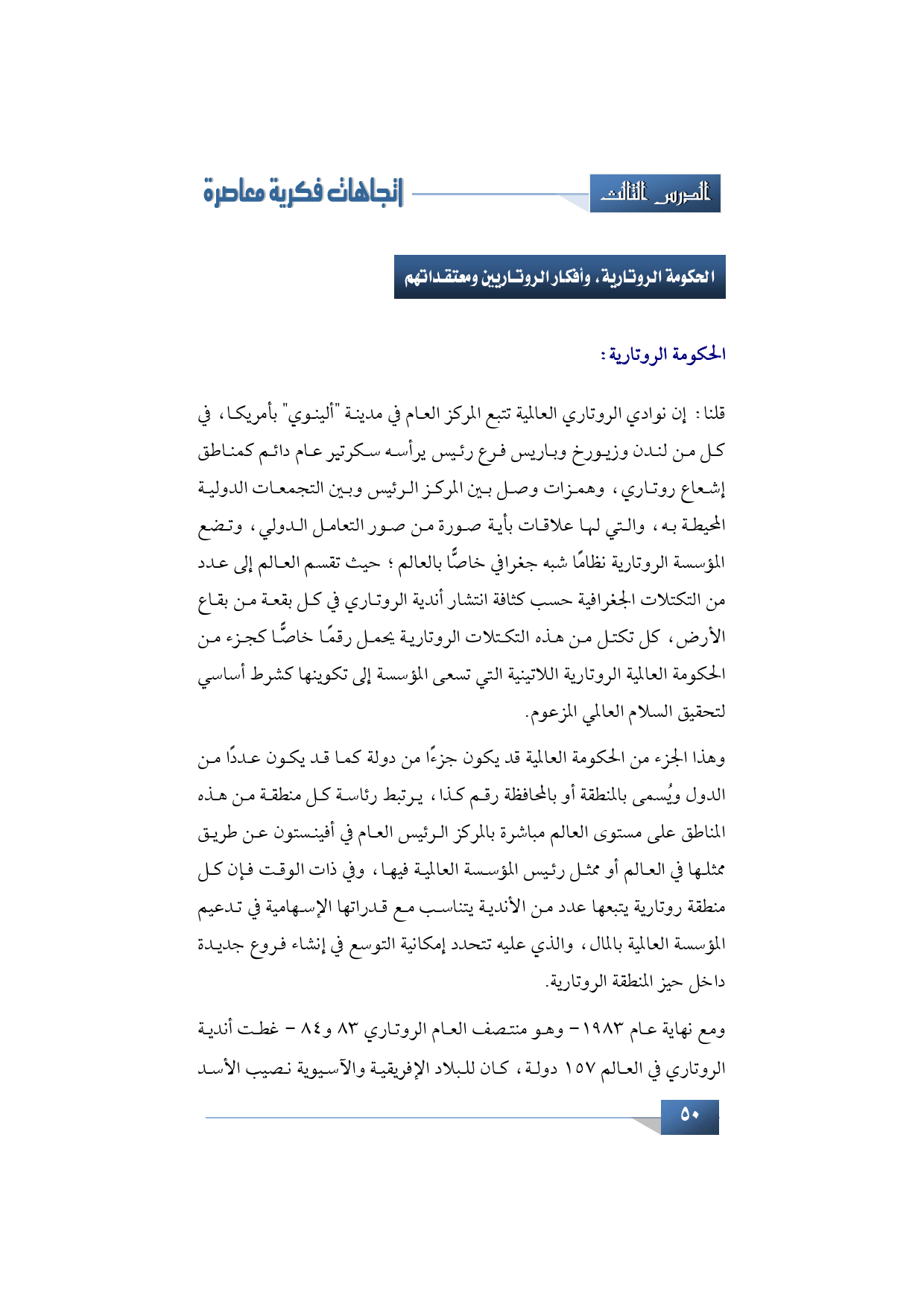 قلنا: إن نوادي الروتاري العالمية تتبع المركز العام في مدينة ألين ي وي بأمريكا، في كل من لندن وزيورخ وباريس فرع رئيسي يرأسه سكرتير عام دائم كمناطق إشعاع روتاري، وهمزات وصل بين المركز الرئيسي وبين التجمعات الدولية المحيطة به، والتي لها علاقات بأي صورة من صور التعامل الدولي، وتضع المؤسسة الروتارية نظامًا شبه جغرافي خاصًّا بالعالم، حيث تقسم العالم إلى عدد من التكتلات الجغرافية حسب كثافة انتشار أندية الروتاري في كل بقعة من بقاع الأرض، كل تكتل من هذه التكتلات الروتارية يحمل رقمًا خاصًّا كجزء من الحكومة العالمية الروتارية اللا ت ينية التي تسعى المؤسسة إلى تكوينها كشرط أساسي لتحقيق السلام العالمي المزعوم.