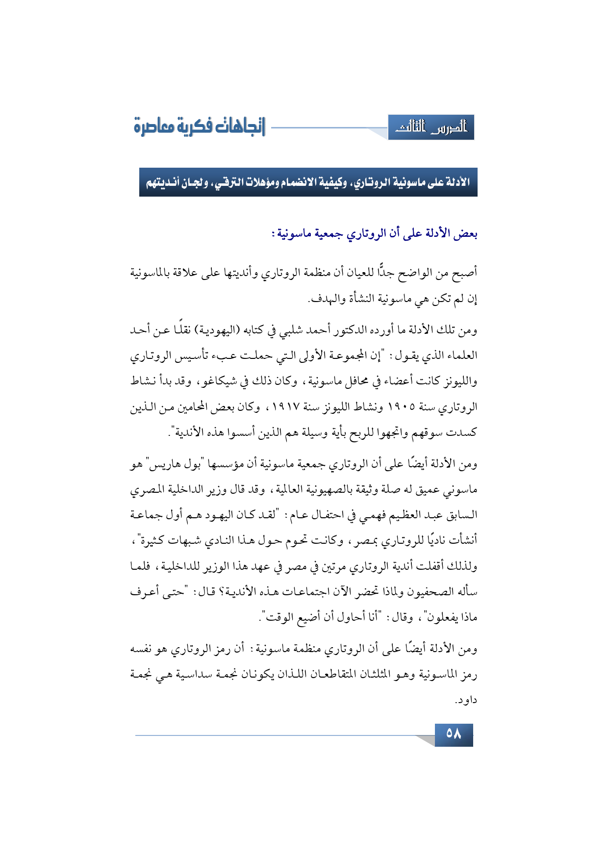 ومن تلك الأدلة ما أورده الدكتور أحمد شلبي في كتابه (اليهودية) نقلًا عن أحد العلماء الذي يقول: " إن المجموعة الأولى التي حملت عبء تأسيس الروتاري والليونز كانت أعضاء في محافل ماسونية، وكان ذلك في شيكاغو، وقد بدأ نشاط الروتاري سنة 1905 ونشاط الليونز سنة 1917، وكان بعض المحامين من الذين كسدت سوقهم واتجهوا للربح بأي وسيلة هم الذين أسسوا هذه الأندية ".