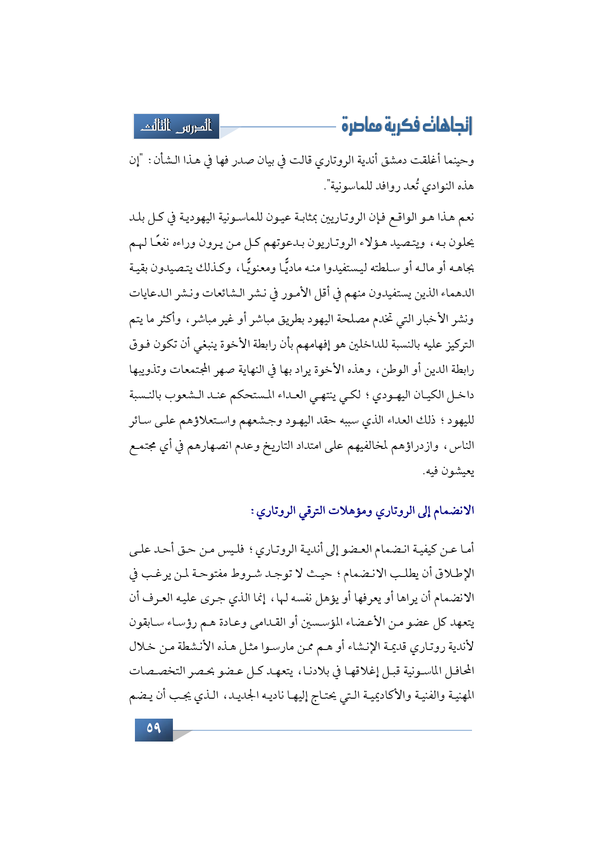 نعم هذا هو الواقع فإن الروتاريين بمثابة عيون للماسونية اليهودية في كل بلد يحلون به، ويتصيد هؤلاء الروتاريون بدعوتهم كل من يرون وراءه نفعًا لهم بجاهه أو ماله أو سلطته ليستفيدوا منه ماديًّا ومعنويًّا، وكذلك يتصيدون بقية الدهماء الذين يستفيدون منهم في أقل الأمور في نشر الشائعات ونشر الدعايات ونشر الأخبار التي تخدم مصلحة اليهود بطريق مباشر أو غير مباشر، وأكثر ما يتم التركيز عليه بالنسبة للداخلين هو إفهامهم بأن رابطة الأخوة ينبغي أن تكون فوق رابطة الدين أو الوطن، وهذه الأخوة يراد بها في النهاية صهر المجتمعات وتذويبها داخل الكيان اليهودي لكي ينتهي العداء المستحكم عند الشعوب بالنسبة لليهود، ذلك العداء الذي سببه حقد اليهود وجشعهم واستعلا ئ هم على سائر الناس، وازدرائهم لمخالفيهم على امتداد التاريخ وعدم انصهارهم في أي مجتمع يعيشون فيه.