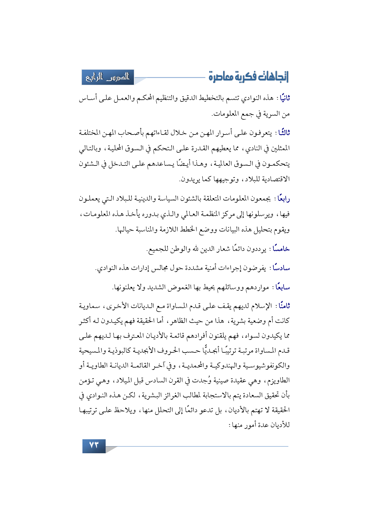 ثامنًا: أن الإسلام لديهم يقف على قدم المساواة مع الديانات الأخرى سماوية كانت أم وضعية بشرية، هذا من حيث الظاهر، أما الحقيقة فهم يكيدون له أكثر مما يكيدون لسواه، فهم يلقنون أفرادهم قائمة بالأديان المعترف بها لديهم على قدم المساواة مرتبة ترتيبًا أبجدي ًّ احسب الحروف الأبجدية كالبوذية والمسيحية والكونفوشيوسية والهندوكية والمحمدية، وفي آخر القائمة الطاوية أو الطاويزم، وهي عقيدة صينية وُجدت في القرن السادس قبل الميلاد، وهي تؤمن بأن تحقيق السعادة يتم بالاستجابة لمطالب الغرائز البشرية، لكن هذه النوادي في الحقيقة لا تهتم بالأديان، بل تدعو دائمًا إلى التحلل منها، ويلاحظ على ترتيبها للأديان عدة أمور منها: