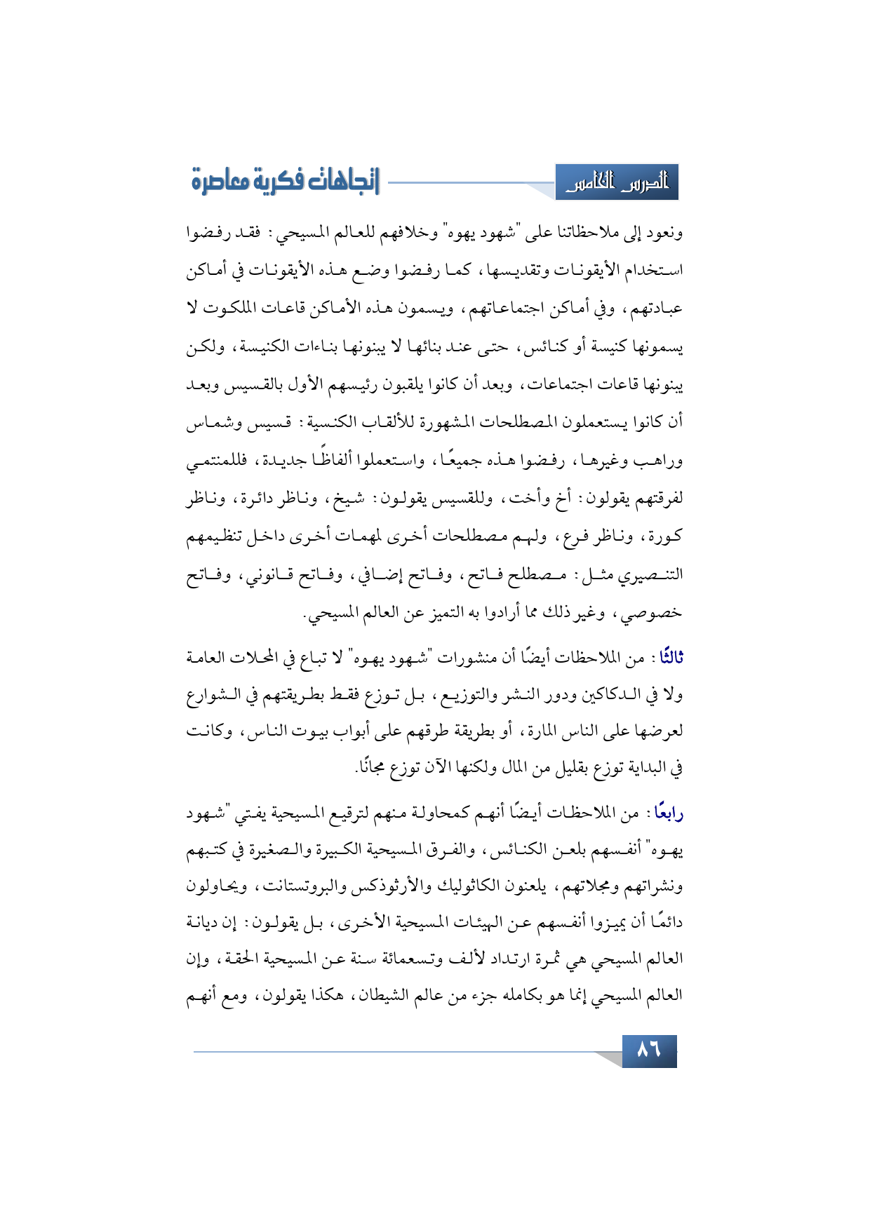 رابعًا: من الملاحظات أيضًا أنهم كمحاولة منهم لترقيع المسيحية يفتي شهود يهوه أنفسهم بلعن الكنائس، والفرق المسيحية الكبيرة والصغيرة في كتبهم ونشراتهم ومجلاتهم، يلعنون الكاثوليك والأرثوذكس والبروتستانت، ويحاولون دائمًا أن يميزوا أنفسهم عن الهيئات المسيحية الأخرى، بل يقولون: إن ديانة العالم المسيحي هي ثمرة ارتداد لألف وتسعمائة سنة عن المسيحية الحقة، وإن العالم المسيحي إنما هو بكامله جزء من عالم الشيطان، هكذا يقولون، ومع أنهم