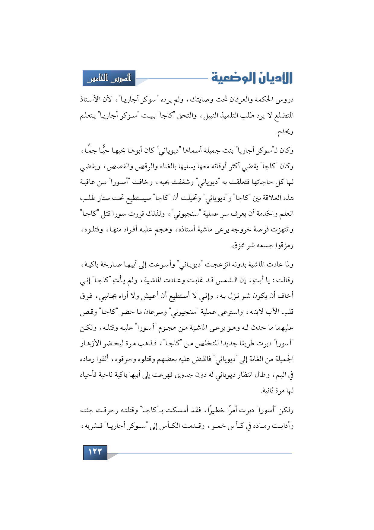 وكان لـ"سوكر أجاريا " بنت جميلة أسماها " ديويا ن ي " كان أبوها يحبها حبًّا جمَّا، وكان "كاجا" يقضي أكثر أوقاته معها يسليها بالغناء والرقص والقصص ويقضي لها كل حاجاتها فتعلقت به " ديوياني " وشغفت بحبه، وخافت " أسورا " من عاقبة هذه العلاقة بين "كاجا" و " ديوياني " وتخيلت أن "كاجا" سيستطيع تحت ستار طلب العلم والخدمة أن يعرف سر عملية " سنجيوني "، ولذلك قررت سورا قتل "كاجا" وانتهزت فرصة خروجه يرعى ماشية أستاذه، وهجم عليها أفراد منها، وقتلوه، ومزقوا جسمه شر ممزق.