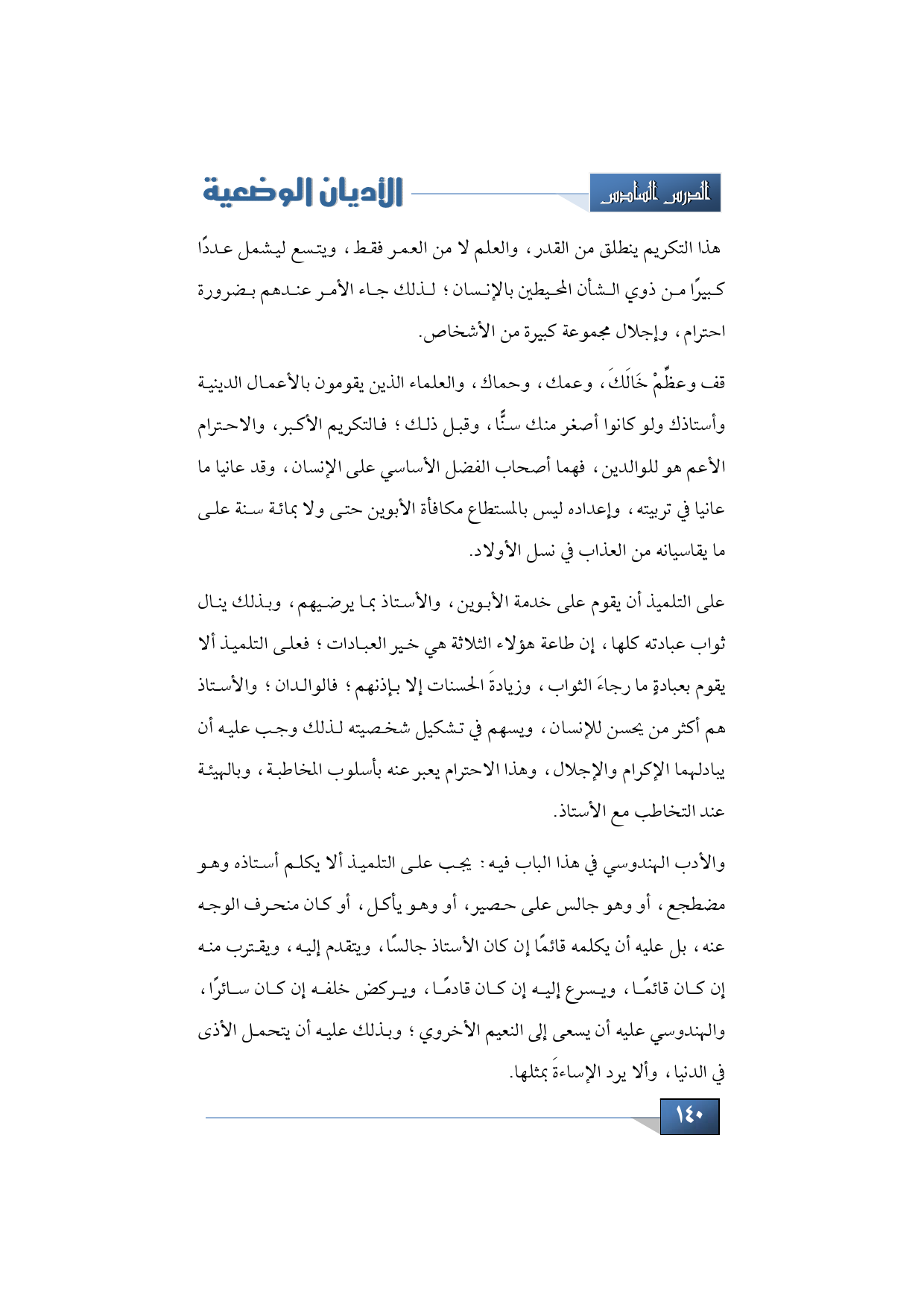 والأدب الهندوسي في هذا الباب فيه: يجب على التلميذ ألا يكلم أستاذه وهو مضطجع، أو وهو جالس على حصير، أو وهو يأكل، أو كان منحرف الوجه عنه، بل عليه أن يكلمه قائمًا إن كان الأستاذ جالسًا، ويتقدم إليه، ويقترب منه إن كان قائمًا، ويسرع إليه إن كان قادمًا، ويركض خلفه إن كان سائرًا، والهندوسي عليه أن يسعى إلى النعيم الأخروي؛ وبذلك عليه أن يتحمل الأذى في الدنيا، وألا يرد الإساءةَ بمثلها.