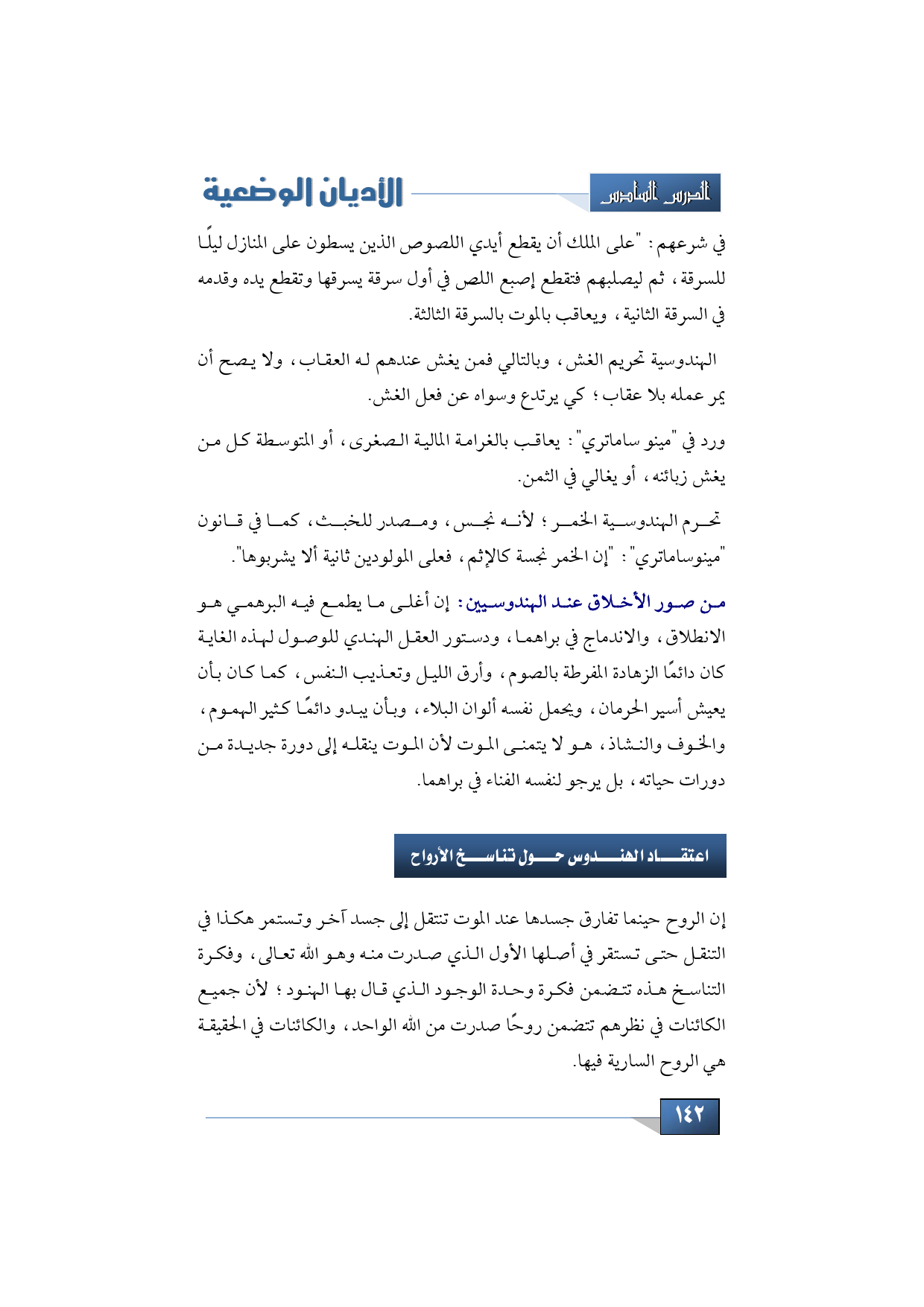 يقول شرعهم: "على الملك أن يقطع أيدي اللصوص الذين يسطون على المنازل ليلًا للسرقة، ثم ليصلبهم فتقطع إصبع اللص في أول سرقة يسرقها وتقطع يده وقدمه في السرقة الثانية، ويعاقب بالموت بالسرقة الثالثة، ومن آداب الهندوسية، وشرعها تحريم الغش، وبالتالي فمن يغش عندهم له العقاب، ولا يصح أن يمر عمله بلا عقاب؛ كي يرتدع سواه كي يرتدع وسواه عن فعل الغش.