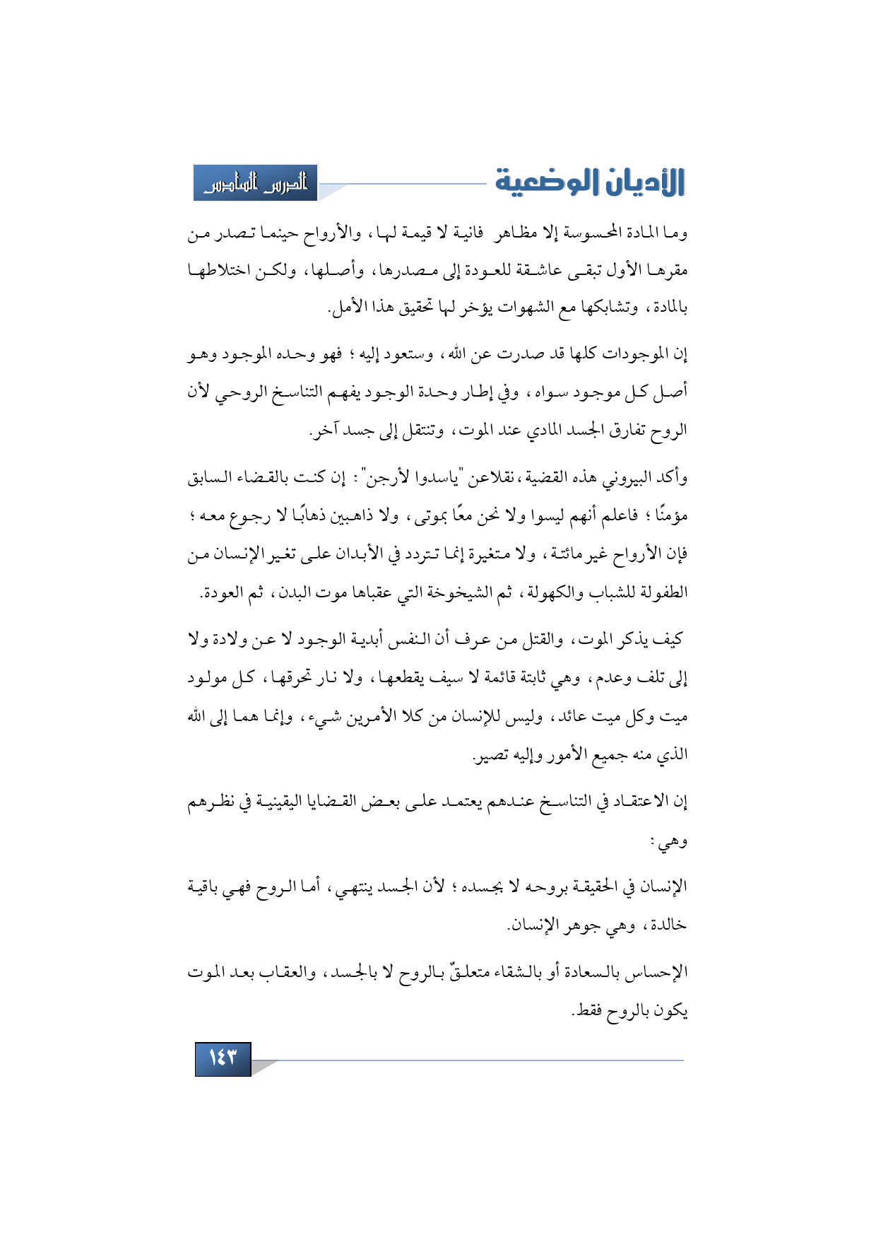 وأكد البيروني هذه القضية، ويورد نصوص من الكتب الهندوسية تقول: قال ياسدوا لأرجن: إن كنت بالقضاء السابق مؤمنًا؛ فاعلم أنهم ليسوا، ولا نحن معًا بموتى، ولا ذاهبين ذهابًا لا رجوع معه؛ فإن الأرواح غير مائتة، ولا متغيرة إنما تتردد في الأبدان على تغير الإنسان من الطفولة للشباب والكهولة، ثم الشيخوخة التي عقباها موت البدن، ثم العودة كيف يذكر الموت، والقتل من عرف أتن النفس أبدية الوجود لا عن ولادة ولا إلى تلف وعدم، وهي ثابتة قائمة لا سيف يقطعها، ولا نار تحرقها، كل مولود ميت وكل ميت عائد، وليس للإنسان من كلا الأمرين شيء، وإنما هما إلى الله الذي منه جميع الأمور وإليه تصير.