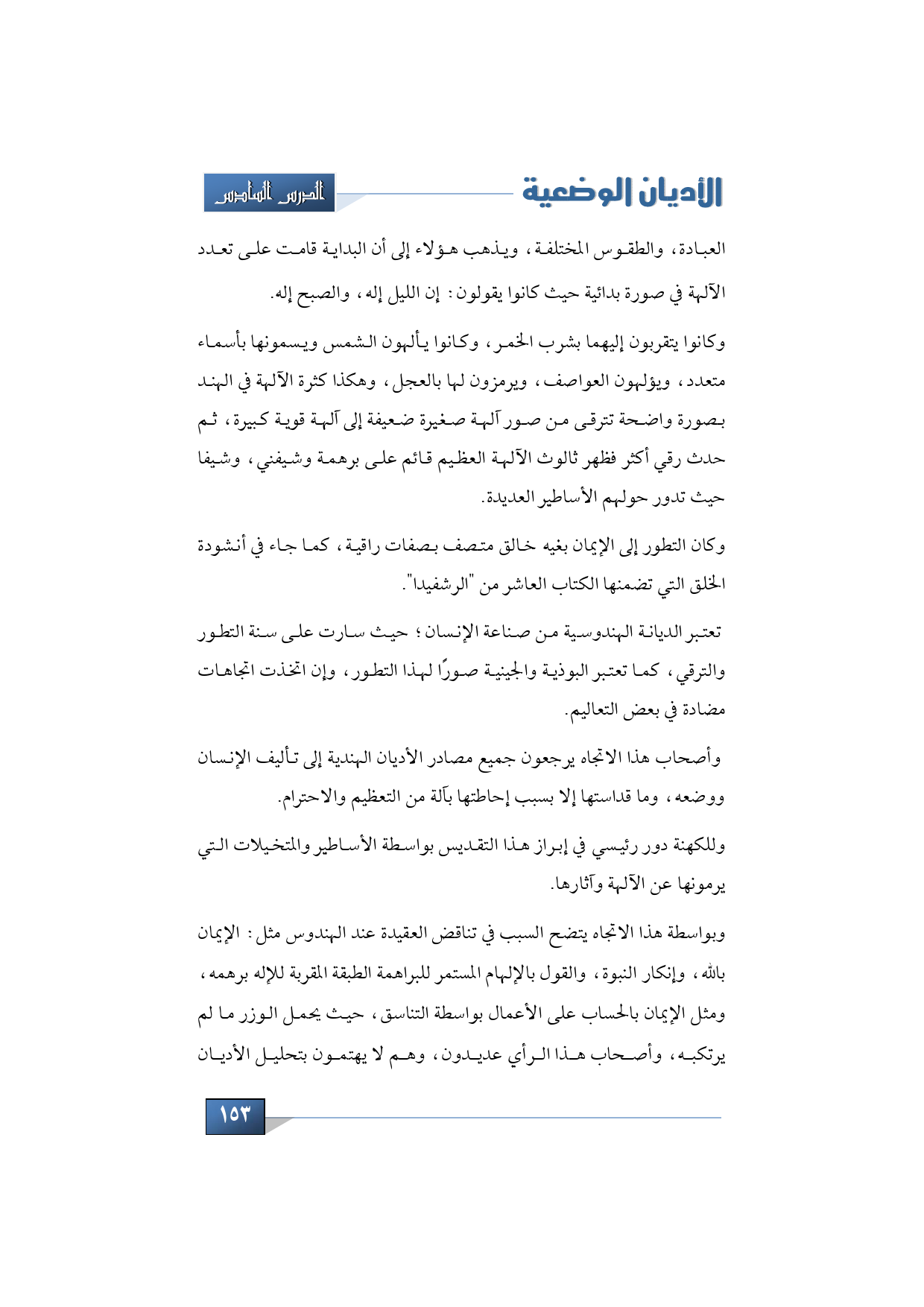 وأخيرًا كان التطور إلى الإيمان بغله خالق متصف بصفات راقية، كما جاء في أنشودة الخلق التي تضمنها الكتاب العاشر من "الرشفيدا"، وعلى هذا تعتبر الديانة الهندوسية من صناعة الإنسان؛ حيث سارت على سنة التطور والترقي كما تعتبر البوذية والجينية صورًا لهذا التطور، وإن اتخذت اتجاهات مضادة في بعض التعاليم، وأصحاب هذا الاتجاه يرجعون جميع مصادر الأديان الهندية إلى تأليف الإنسان ووضعه، وما قداستها إلا بسبب إحاطتها بآلة من التعظيم والاحترام.