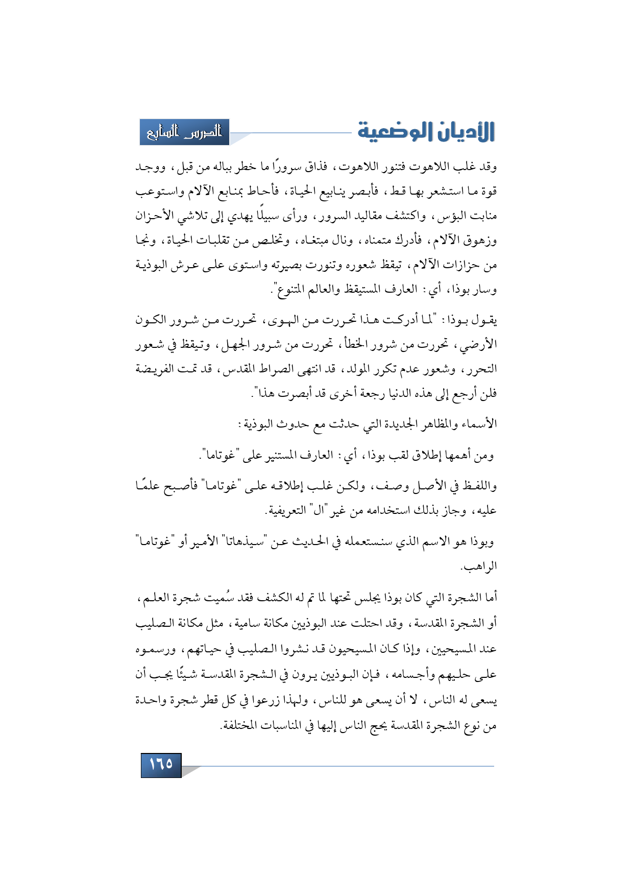 أما الشجرة التي كان بوذا يجلس تحتها لما تم له الكشف فقد سُميت شجرة العلم، أو الشجرة المقدسة، وقد احتلت عند البوذيين مكانة سامية، مثل مكانة الصليب عند المسيحيين، وإذا كان المسيحيون قد نشروا الصليب في حياتهم، ورسموه على حليهم وأجسامه، فإن البوذيين يرون في الشجرة المقدسة شيئًا يجب أن يسعى له الناس، لا أن يسعى هو للناس، ولهذا زرعوا في كل قطر شجرة واحدة من نوع الشجرة المقدسة يحج الناس إليها في المناسبات المختلفة.