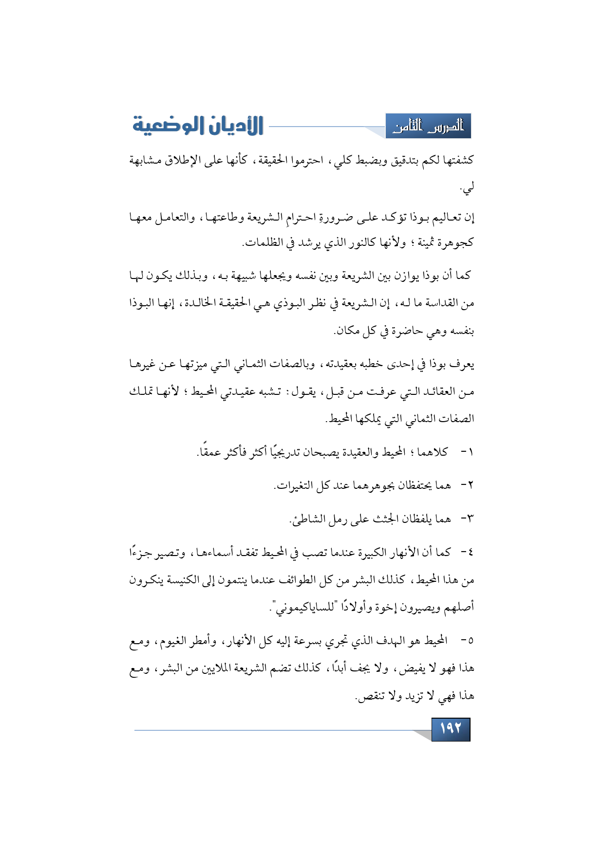 الواضح: أن تعاليم بوذا الواردة في هذه المقاطع تؤكد على ضرورةِ احترامِ الشريعة وطاعتها، والتعامل معها كجوهرة ثمينة، ولأنها كالنور الذي يرشد في الظلمات، كما أن بوذا يوازن بين الشريعة وبين نفسه ويجعلها شبيهة به، وبذلك يكون لها من القداسة ما له، إن الشريعة في نظر البوذي هي الحقيقة الخالدة، إنها البوذا بنفسه وهي حاضرة في كل مكان، ولا تتغير وهي جدًّا رائعة، وسنعرض فيما بعد لأهم ما جاء في الشريعة البوذية في شتى مسائل الوجود، والآلهة، والأخلاق، والتنظيم الاجتماعي الفقهي القانوني -إن شاء الله تعالى.