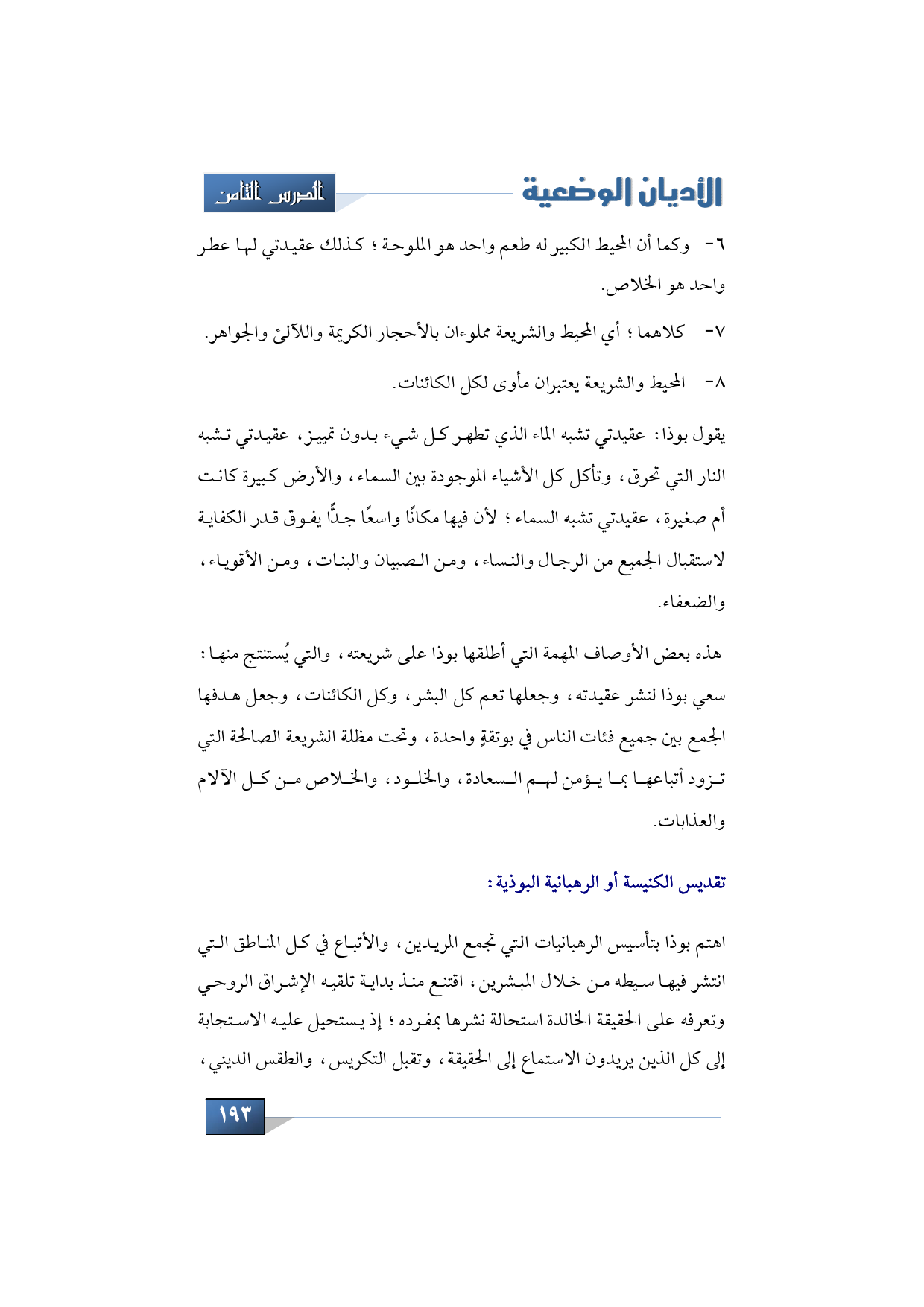 ويضيف البوذا عقيدتي تشبه الماء الذي تطهر كل شيء بدون تمييز، عقيدتي تشبه النار التي تحرق، وتأكل كل الأشياء الموجودة بين السماء، والأرض كبيرة كانت أم صغيرة، عقيدتي تشبه السماء؛ لأن فيها مكانًا واسعًا جدًّا يفوق قدر الكفاية لاستقبال الجميع من الرجال والسناء، ومن الصبيان والبنات، ومن الأقوياء، والضعفاء، هذه بعض الأوصاف المهمة التي أطلقها البوذا على شريعته، والتي يُستنتج منها سعي البوذا لنشر عقيدته، وجعلها تعم كل البشر، وكل الكائنات، وجعل هدفها الجمع بين جميع فئات الناس في بوتقةٍ واحدة، وتحت مظلة الشريعة الصالحة التي تزود أتباعها بما يؤمن لهم السعادة، والخلود، والخلاص من كل الآلام والعذابات.