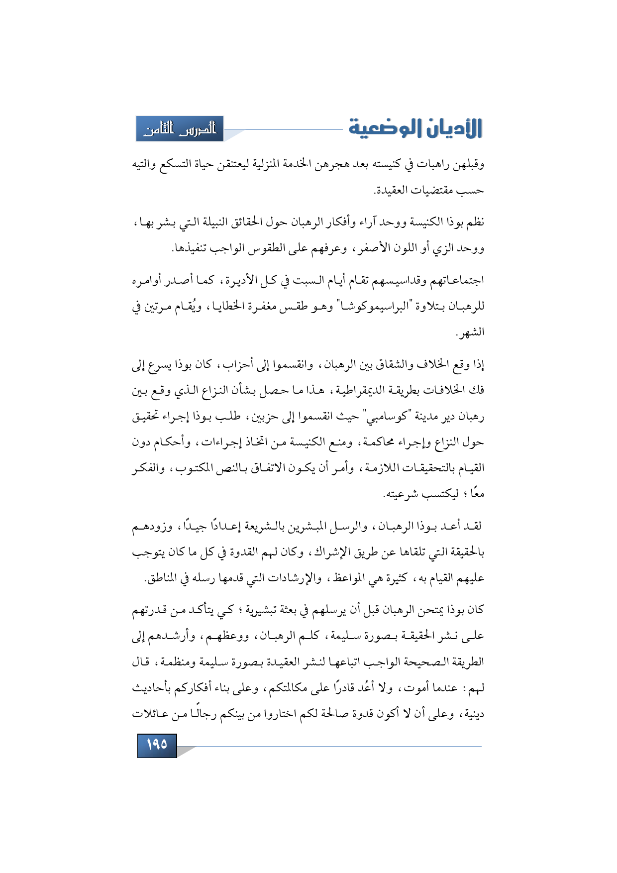 نظم بوذا الكنيسة ووحد أراء وأفكار الرهبان حول الحقائق النبيلة التي بشر بها، ووحد الزي أو اللون الأصفر وعرفهم على الطقوس الواجب تنفيذها اجتماعاتهم وقداسيسهم التي تقام أيام السبت وفي كل الأديرة كما أصدر أوامره للرهبان بتلاوة "البراسيموكوشا" وهو طقس مغفرة الخطايا، ويُقام مرتين في الشهر.