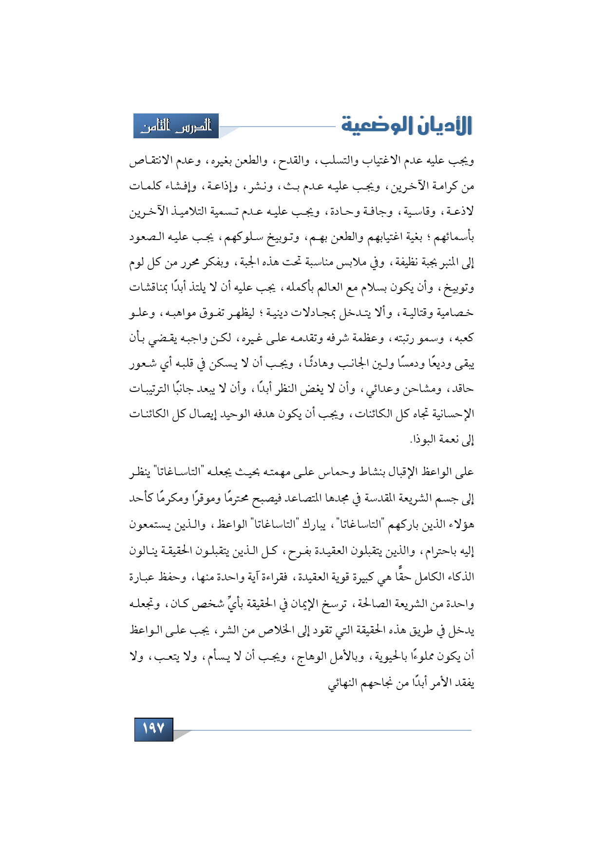 على الواعظ الإقبال بنشاط وحماس على مهمته بحيث يجعله الداساغاتا ينظر إلى جسم الشريعة المقدسة في مجدها المتصاعد فيصبح محترمًا وموقرًا ومكرمًا كأحد هؤلاء الذين باركهم "التاساغاتا"، يبارك "التاساغاتا" الواعظ، والذين يستمعون إليه باحترام، والذين يتقبلون العقيدة بفرح، كل الذين يتقبلون الحقيقة ينالون الذكاء الكامل حقًّا هي كبيرة قوية العقيدة، فقراءة آية واحدة منها، وحفظ عبارة واحدة من الشريعة الصالحة ترسخ الإيمان في الحقيقة بأيِّ شخص كان، وتجعله يدخل في طريق هذه الحقيقة التي تقود إلى الخلاص من الشر، يجب على الواعظ أن يكون مملوءًا بالحيوية، وبالأمل الوهاج، ويجب أن لا يسأم، ولا يتعب، ولا يفقد الأمر أبدًا من نجاحهم النهائي.