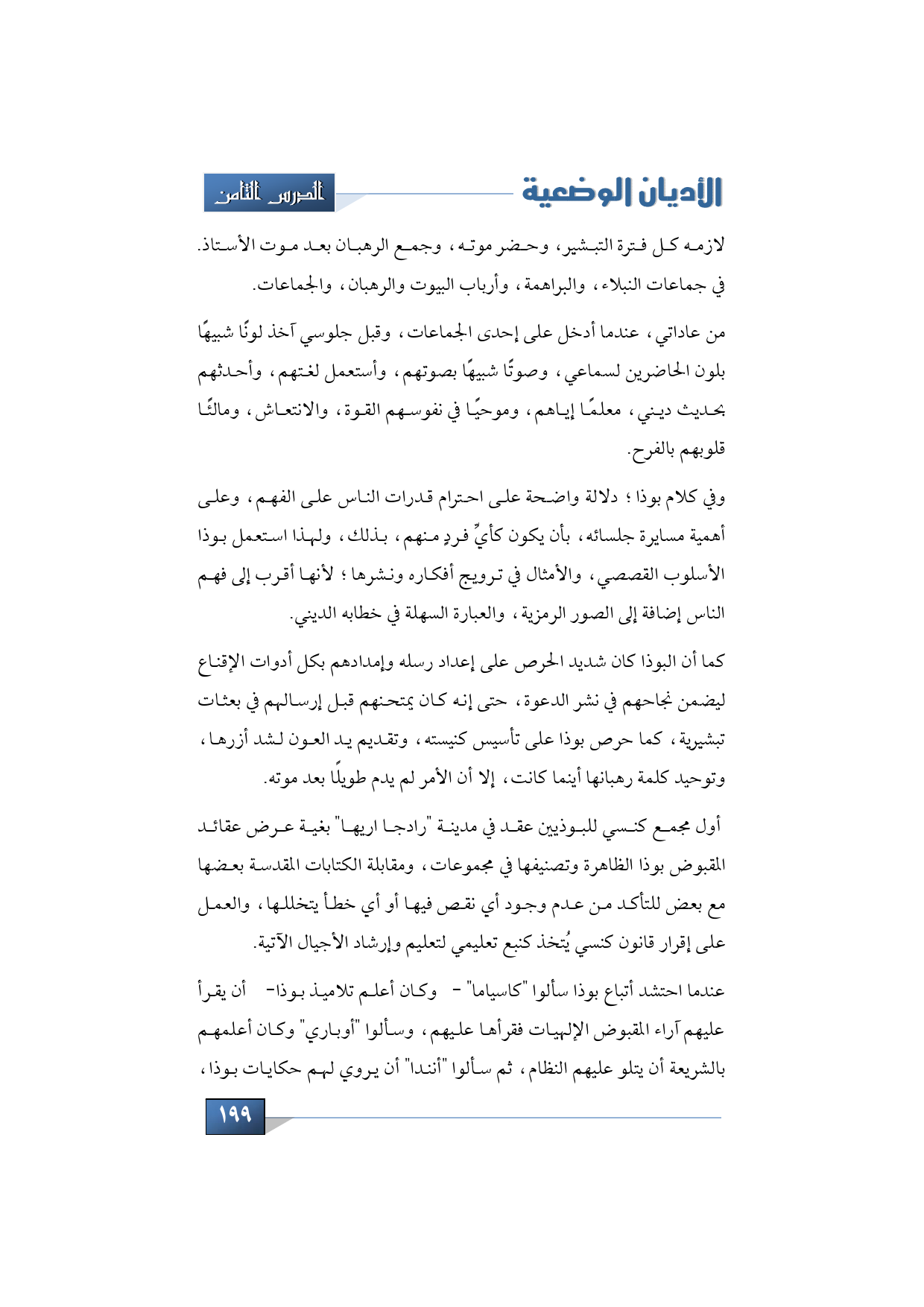 كما أن البوذا كان شديد الحرص على إعداد رسله وإمدادهم بكل أدوات الإقناع ليضمن نجاحهم في نشر الدعوة حتى إنه كان يمتحنهم قبل إرسالهم في بعثات تبشيرية، كما حرص بوذا على تأسيس كنيسته، وتقديم يد العون لشد أزرها، وتوحيد كلمة رهبانها أينما كانت، إلا أن الأمر لم يدم طويلًا بعد موته، أول مجمع كنسي للبوذيين عقد في مدينة "رادجا اريها" بغية عرض عقائد المقبوض بوذا الظاهرة وتصنيفها في مجموعات، ومقابلة الكتابات المقدسة بعضها مع بعض للتأكد من عدم وقود أي نقص فيها أو أي خطأ يتخللها، والعمل على إقرار قانون كنسي يُتخذ كنبع تعليمي لتعليم وإرشاد الأجيال الآتية.