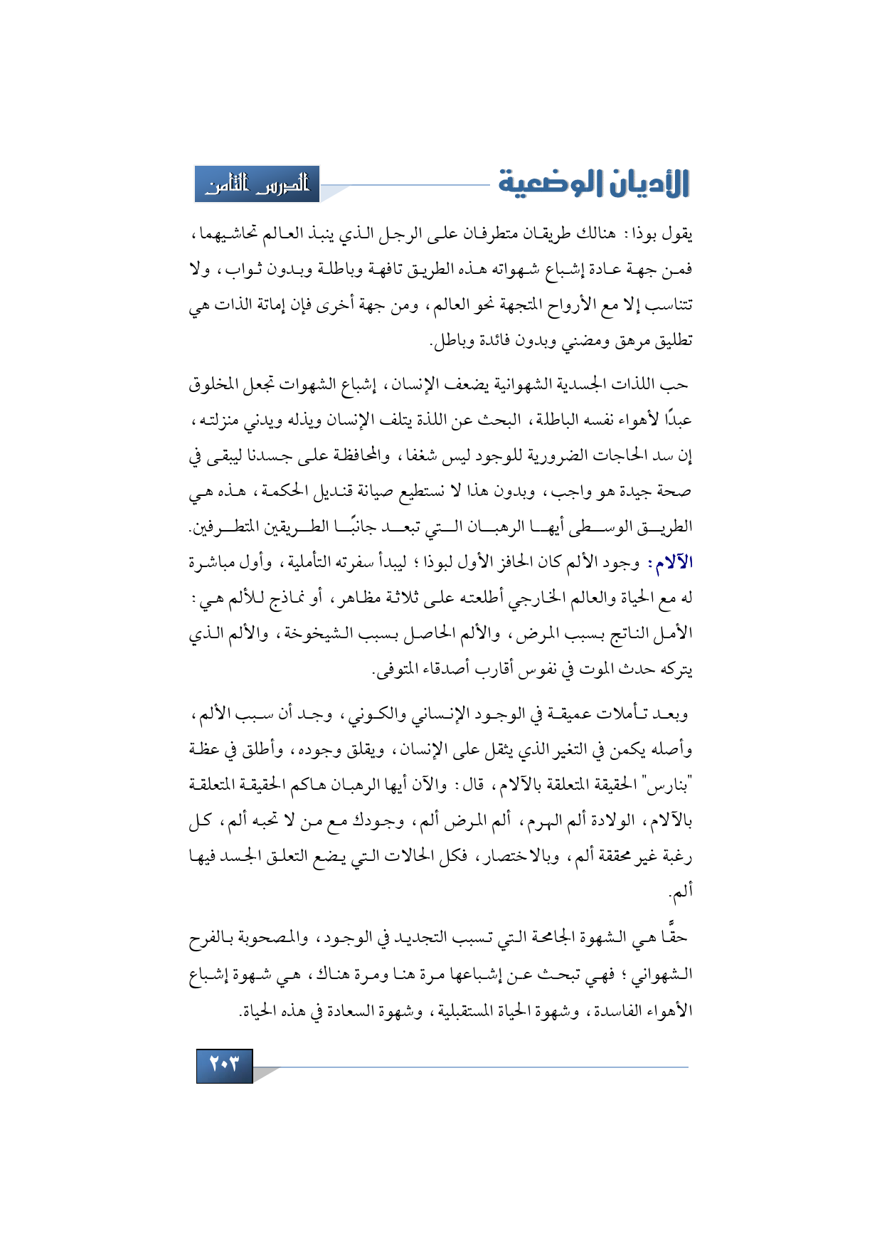 يقول: هنالك طريقان متطرفان على الرجل الذي ينبذ العالم تحاشيهما، فمن جهة عادة إشباع شهواته هذه الطريق تافهة وباطلة وبدون ثواب، ولا تتناسب إلا مع الأرواح المتجهة نحو العالم، ومن جهة أخرى فإن إماتة الذات هي تطليق مرهق ومضني وبدون فائدة وباطل، حب اللذات الجسدية الشهواية يضعف الإنسان، إشباع الشهوات تجعل المخلوق عبدًا لأهواء نفسه الباطلة، البحث عن اللذة يتلف الإنسان ويذله ويدني منزلته، إن سد حاجات ضرورات الوجود ليس شغف، والمحافظة على جسدنا ليبقى في صحة جيدة هو واجب، وبدون هذا لا نستطيع صيانة قنديل الحكمة، هذه هي الطريق الوسطى أيها الرهبان التي تبعد جانبًا الطريقين المتطرفين.