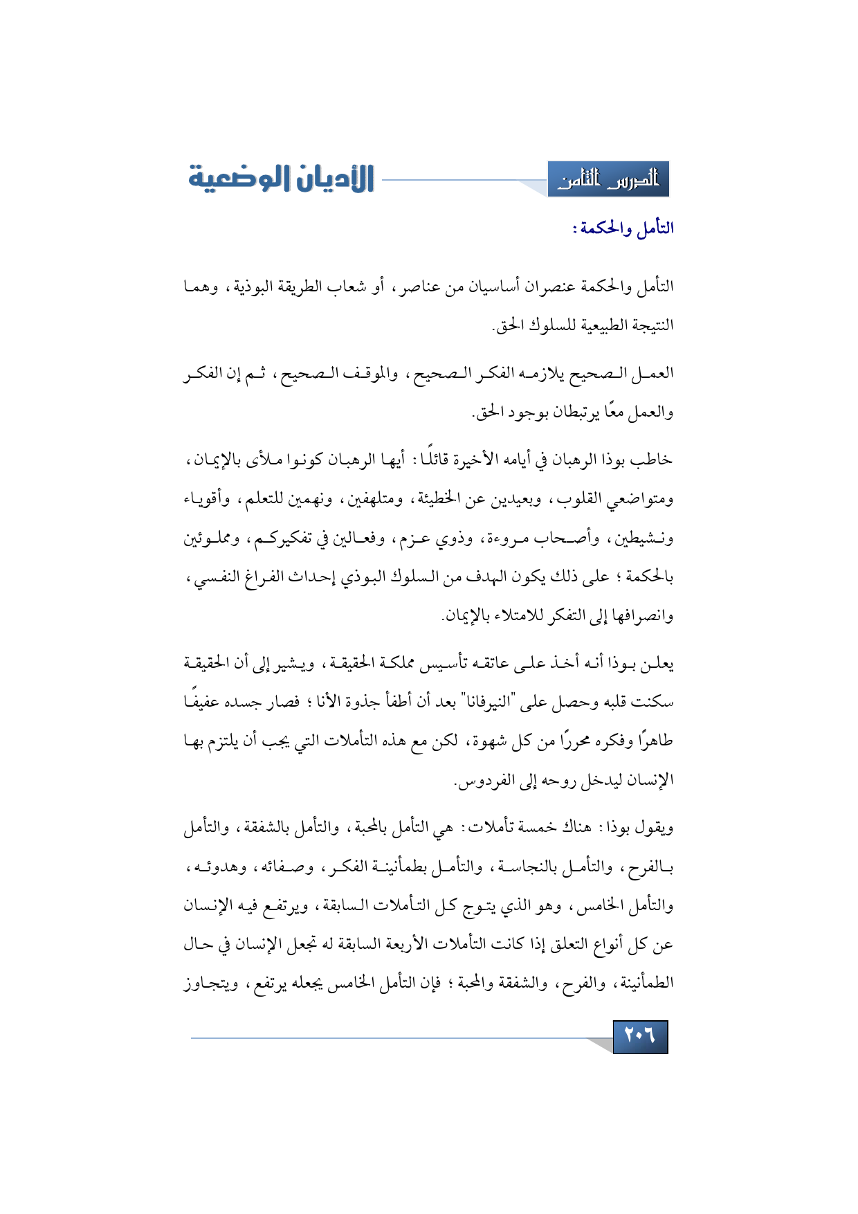 ومن العناصر الرئيسة في الديانة البوذية: التأمل والحكمة: