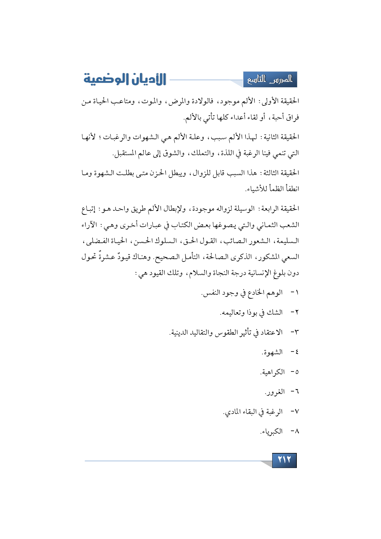 الحقيقة الأولى: الألم موجود، فالولادة والمرض، والموت، ومتاعب الحياة من فراق أحبة، أو لقاء أعداء كلها تأتي بالألم.