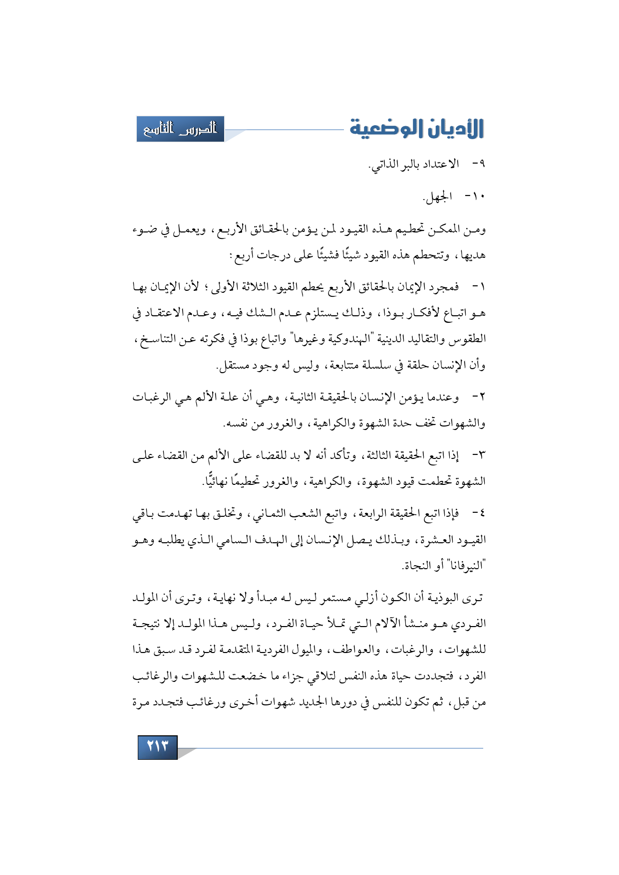 4 - فإذا اتبع الحقيقة الرابعة، واتبع الشعب الثماني، وتخلق بها تهدمت باقي القيود العشرة، وبذلك يصل الإنسان إلى الهدف السامي الذي يطلبه وهو "النيرفانا" أو النجاة.