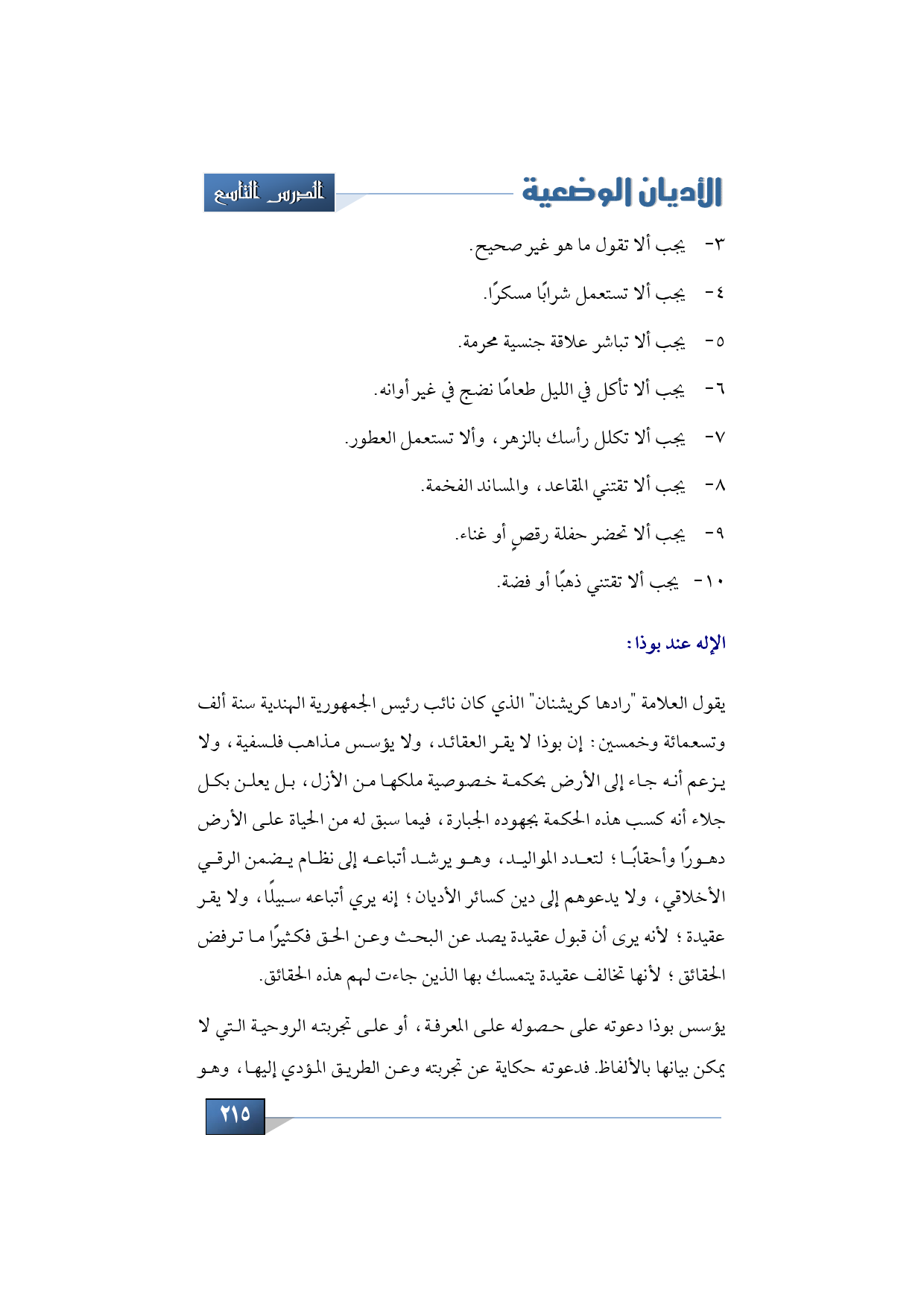 يقول العلامة "رادها كريشنان" الذي كان نائب رئيس الجمهورية الهندية سنة ألف وتسعمائة وخمسون: إن بوذا لا يقر العقائد، ولا يؤسس مذاهب فلسفية، ولا يزعم أنه جاء إلى الأرض بحكمة خصوصية ملكها من الأزل، بل يعلن بكل جلاء أنه كسب هذه الحكمة بجهوده الجبارة، فيما سبق له من الحياة على الأرض دهورًا وأحقابًا؛ لتعدد المواليد، وهو يرشد أتباعه إلى نظام يضمن الرقي الأخلاقي، ولا يدعوهم إلى دين كسائر الأديان؛ إنه يري أتباعه سبيلًا، ولا يقر عقيدة؛ لأنه يرى أن قبول عقيدة يصد عن البحث وعن الحق فكثيرًا ما ترفض الحقائق؛ لأنها تخالف عقيدة يتمسك بها الذين جاءت لهم هذه الحقائق.