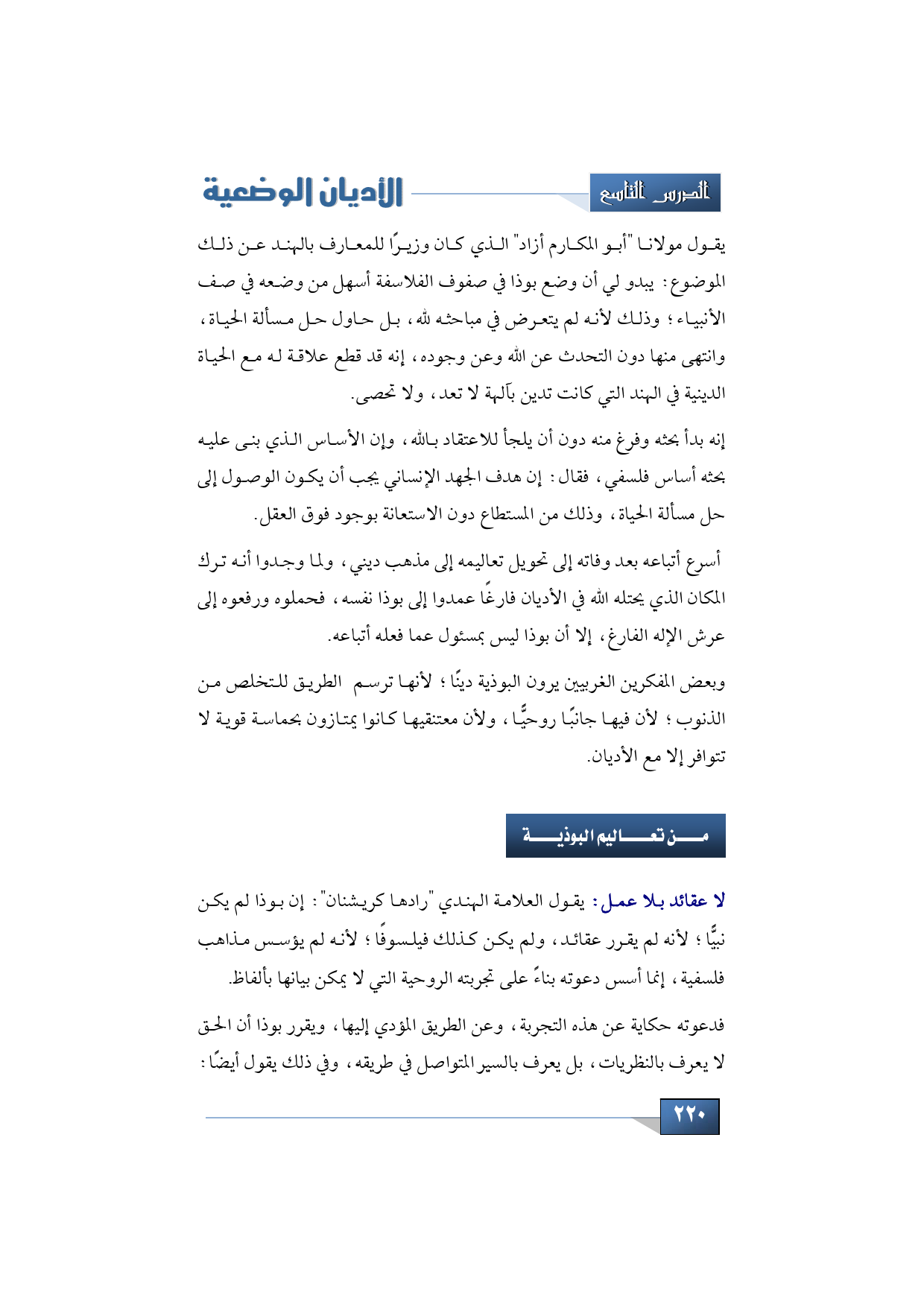 لا عقائد بلا عمل: هذا الموضوع يرتبط بالموضوع السابق إذا كنا آنفا قلنا: إن بوذا ليس نبيًّا، لكنه فيلسوف فإننا هنا ننقل عن العلامة الهندي رادها "كريشنان" أن بوذا لم يكن نبيًّا؛ لأنه لم يقرر عقائد، ولم يكن كذلك فيلسوفًا؛ لأنه لم يؤسس مذاهب فلسفية، إنما أسس دعوته بناءً على تجربته الروحية التي لا يمكن بيانها بألفاظ.