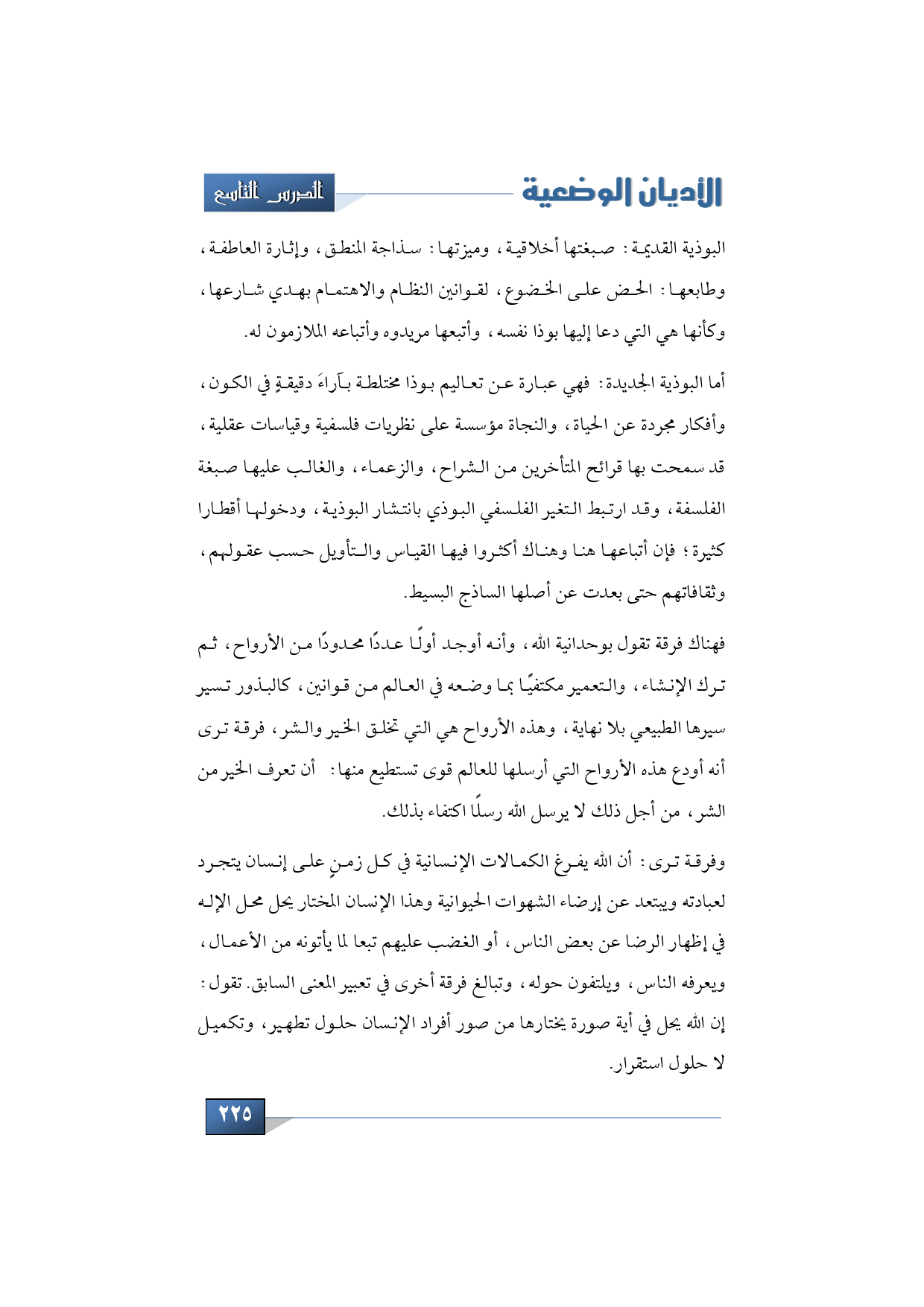 أما البوذية الجديدة فهي عبارة عن تعاليم بوذا مختلطة بآراءَ دقيقةٍ في الكون، وأفكار مجردة عن الحياة، والنجاة مؤسسة على نظريات فلسفية وقياسات عقلية قد سمحت بها قرائح المتأخرين من الشراح، والزعماء والغالب عليها صبغة الفلسفة، وقد ارتبط التغير الفلسفي البوذي بانتشار البوذية، ودخولها أقطار كثيرة؛ فإن أتباعها هنا، وهناك أكثروا فيها القياس والتأويل حسب عقولهم، وثقافاتهم حتى بعدت عن أصلها الساذج البسيط وسنسوق فيما يلي اتجاه الفرق الفلسفية الجديدة، ويلاحظ أن أكثرها أتخذ الاعتراف بالإله أساسًا لفلسفته.
