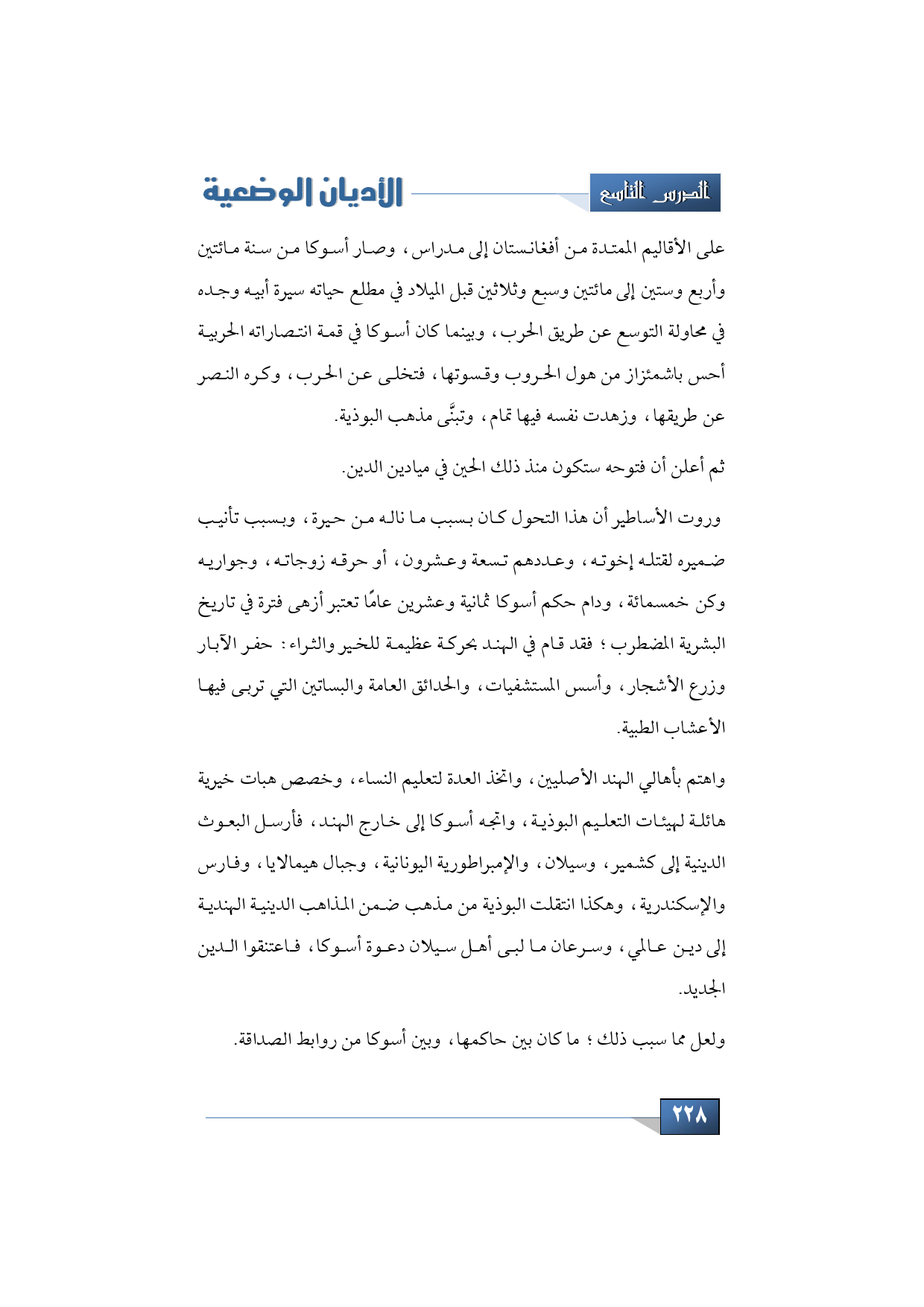 على الأقاليم الممتدة من أفغانستان إلى مدراس، وصار أسوكا من ستة مائتين وأربع وستين إلى مائتين وسبع وثلاثين قبل الميلاد في مطلع حياته سيرة أبيه وجده في محاولة التوسع عن طريق الحرب، وبينما كان أسوكا في قمة انتصاراته الحربية أحس باشمئزاز من هول الحروب وقسوتها، فتخلى عن الحرب، وكره النصر عن طريقها، وزهدت نفسه فيها تمام، وتبنَّى مذهب البوذية.
