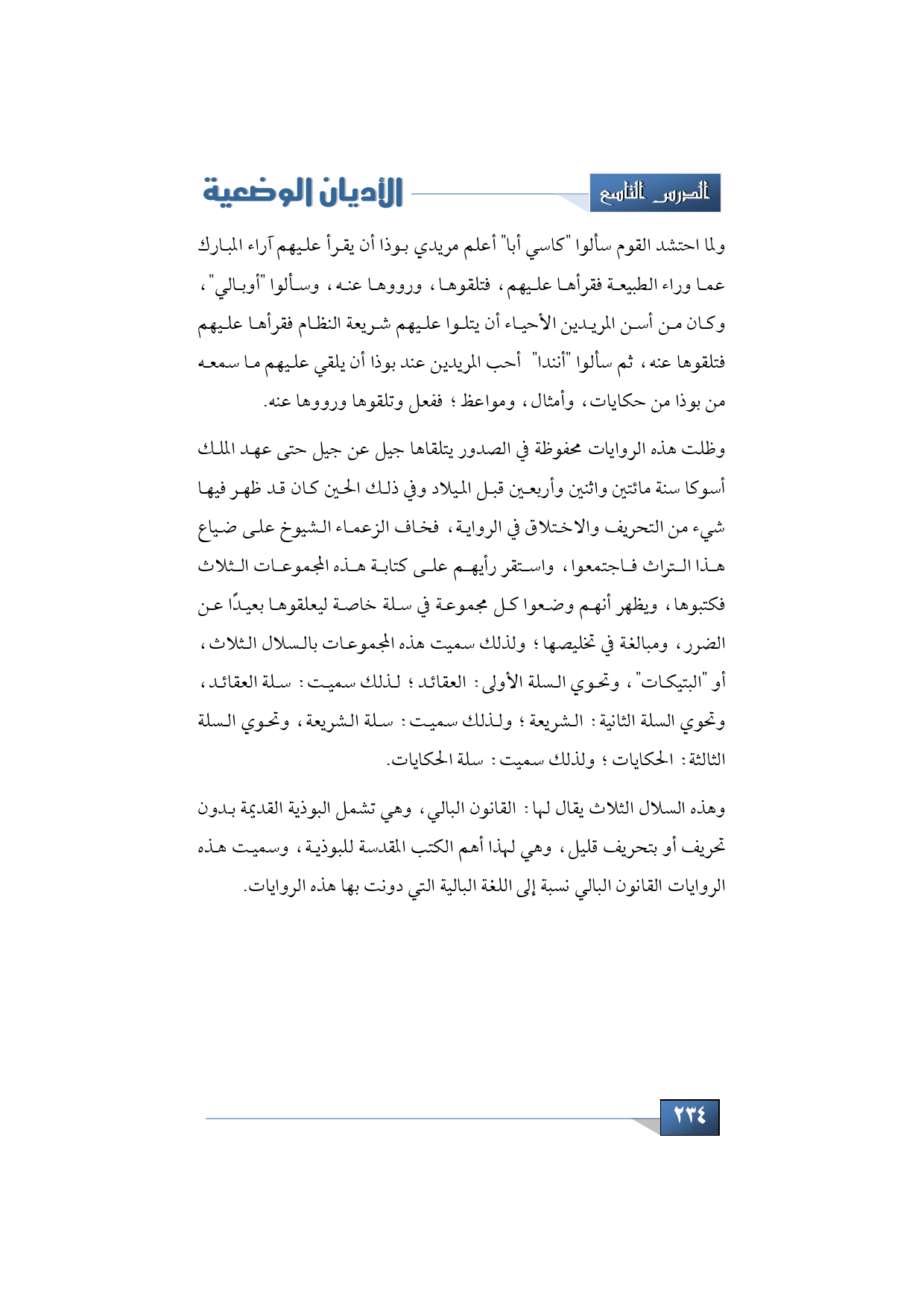 وهذه السلال الثلاث يقال لها: القانون البالي، وهي تشمل البوذية القديمة بدون تحريف أو بتحريف قليل، وهي لهذا أهم الكتب المقدسة للبوذية، وسميت هذه الروايات القانون البالي نسبة إلى اللغة البالية التي دونت بها هذه الروايات، هذا والله أعلم.