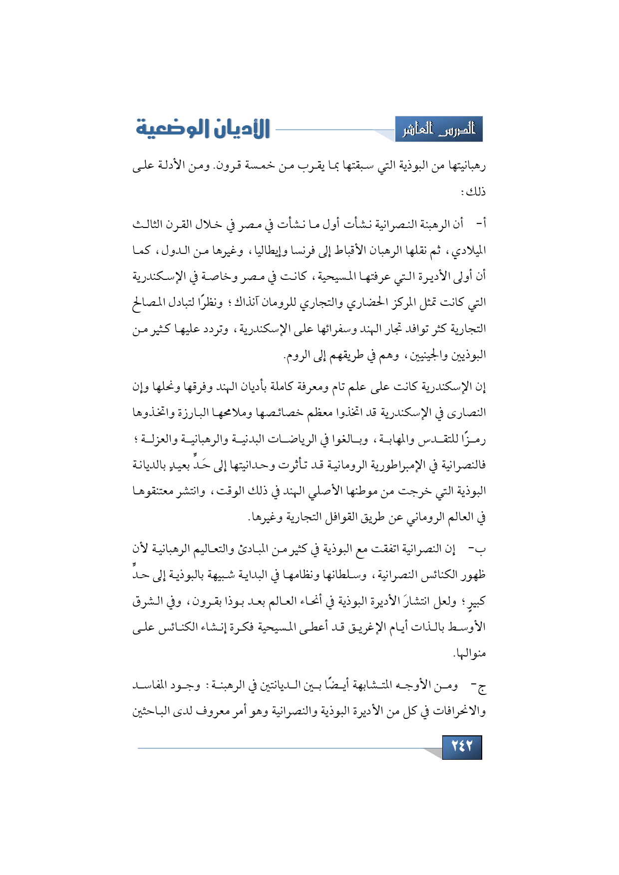 أ- أن الرهبة النصرانية نشأت أول ما نشأت في مصر في خلال القرن الثالث الميلادي، ثم نقلها الرهبان الأقباط إلى فرنسا وإيطاليا، وغيرها من الدول، كما أن أولى الأديرة التي عرفتها المسيحية، كانت في مصر وخاصة في الإسكندرية التي كانت تمثل المركز الحضاري والتجاري للرومان آنذاك؛ ونظرًا لتبادل المصالح التجارية كثر توافد تجار لهند وسفرائها على على الإسكندرية، وتردد عليها كثير من البوذيين والجينيين، وهم في طريقهم إلى الروم.