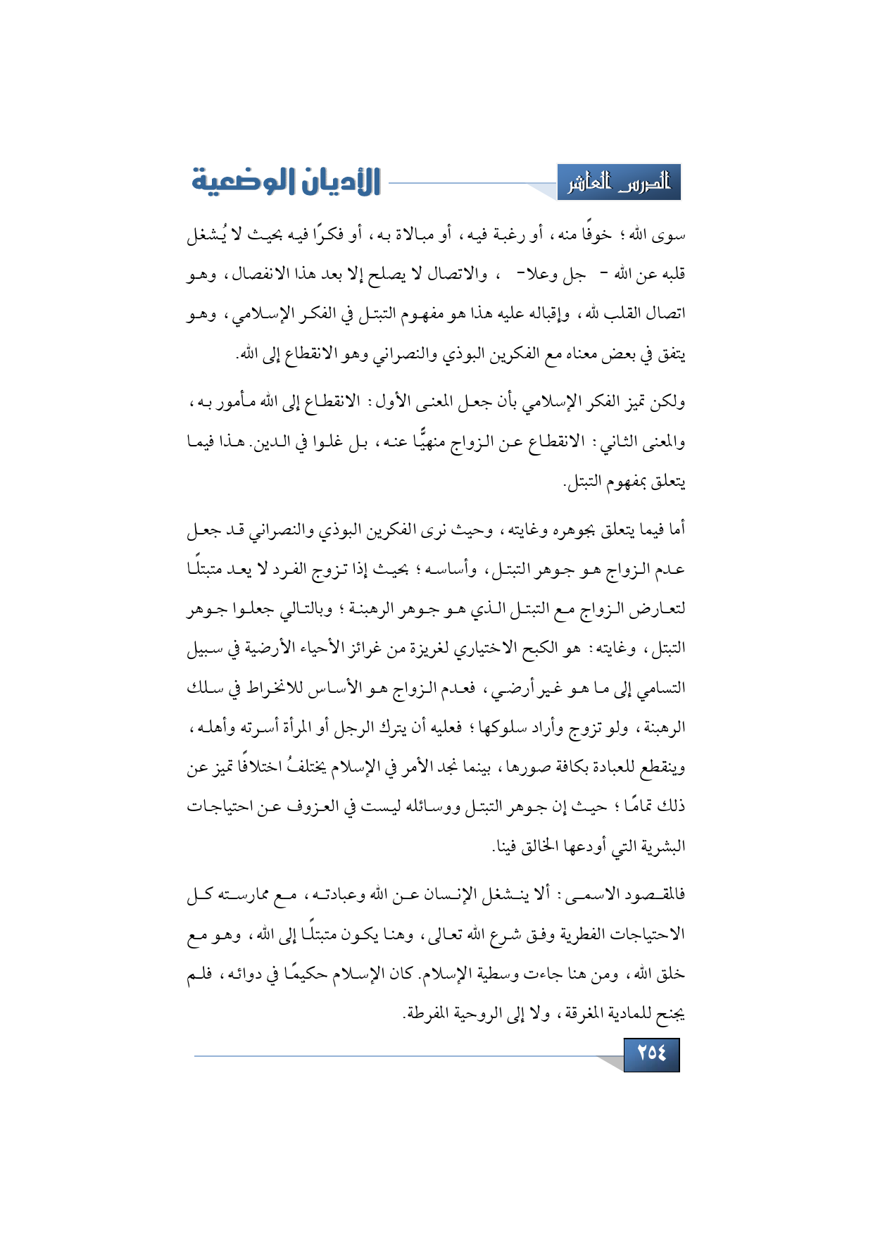 سوى الله؛ خوفًا منه، أو رغبة فيه، أو مبالاة به، أو فكرًا فيه بحيث يشغل قلبه عن الله -جل وعلا- والاتصال لا يصلح إلا بعد هذا الانفصال، وهو اتصال القلب لله، وإقباله عليه هذا هو مفهوم التبتل في الفكر الإسلامي وهو يتفق في بعض معناه مع الفكرين البوذي والنصراني وهو الانقطاع إلى الله.