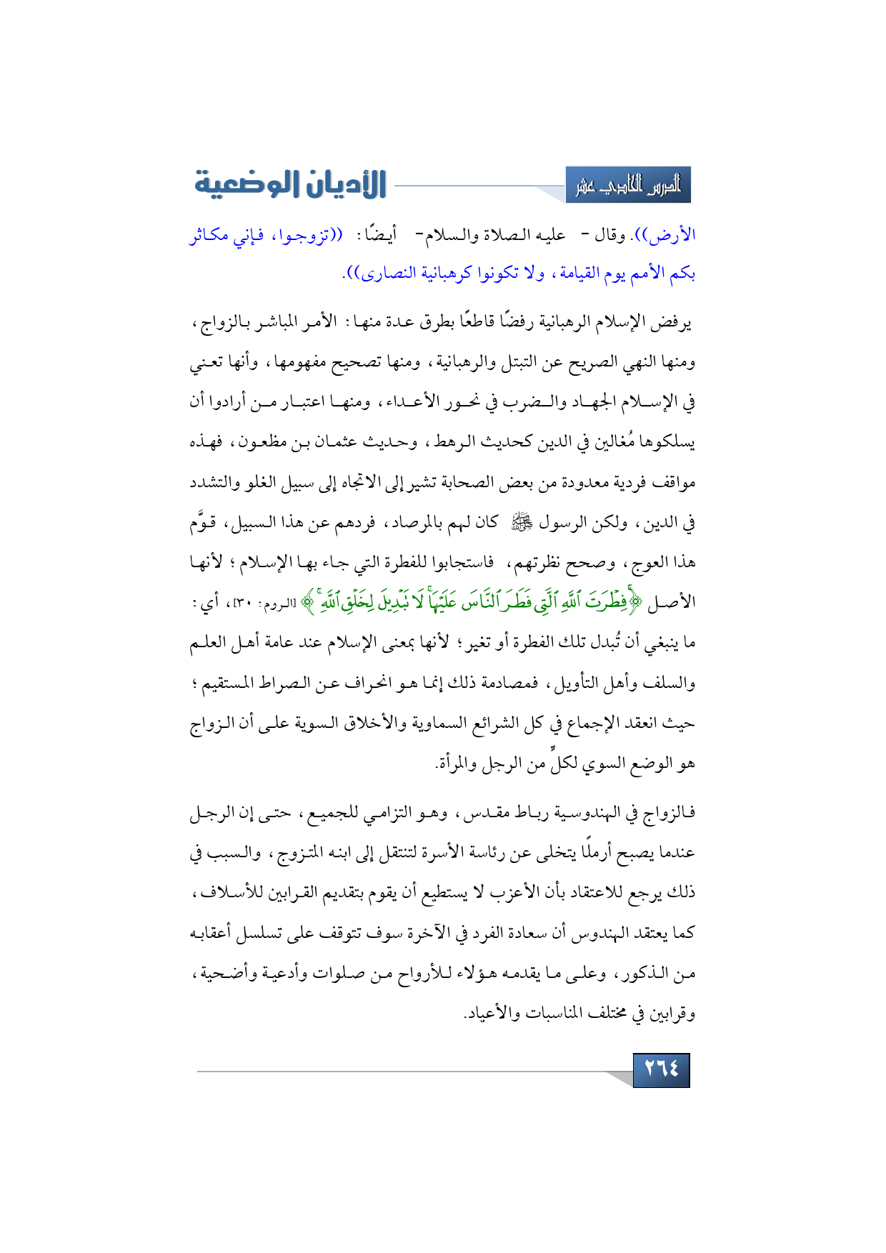 وهكذا يرفض الإسلام الرهبانية رفضًا قاطعًا بطرق عدة منها: الأمر المباشر بالزواج، ومنها النهي الصريح عن التبتل والرهبانية، ومنها تصحيح مفهومها، وأنها تعني في الإسلام الجهاد والضرب في نحور الأعداء، ومنها اعتبار من أرادوا أن يسلكوها مُغالين في الدين كحديث الرهط، وحديث عثمان بن مظعون سالفَي الذكر، فهذه مواقف فردية معدودة من بعض الصحابة تشير إلى الاتجاه إلى سبيل الغلو والتشدد في الدين، ولكن الرسول -صلى الله عليه وآله وسلم- كان لهم بالمرصاد، فردهم عن هذا السبيل، قوَّم هذا العوج، وصحح نظرتهم فاستجابوا للفطرة التي جاء بها الإسلام لأنها الأصل {فِطْرَةَ اللَّهِ الَّتِي فَطَرَ النَّاسَ عَلَيْهَا لَا تَبْدِيلَ لِخَلْقِ اللَّهِ} (الروم: 30)، أي: ما ينبغي أن تُبدل تلك الفطرة أو تغير؛ لأنها بمعنى الإسلام عند عامة أهل العلم والسلف وأهل التأويل، فمصادمة ذلك إنما هو انحراف عن الصراط المستقيم؛ حيث انعقد الإجماع في كل الشرائع السماوية والأخلاقية السوية على أن الزواج هو الوضع السوي لكلٍّ من الرجل والمرأة.