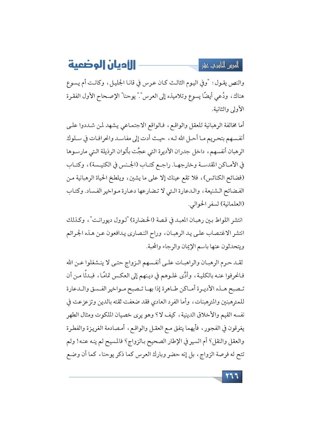 حيث انتشر اللواط بين رهبان المعبد في قصة الحضارة لوول ديورانت، وكذلك انتشر الاغتصاب على يد الرهبان، وراح النصارى يدافعون عن هذه الجرائم ويتحدثون عنها باسم الإيمان والرجاء والمحبة، أي إيمان؟! لقد حرم الرهبان والراهبات على أنفسهم الزواج لأن لا ينشغلوا عن الله فانحرفوا عنه بالكلية، وأدَّى غلوهم في دينهم إلى العكس تمامًا، فبدلًا من أن تصبح هذه الأديرة أماكن طاهرة إذا بها تصبح مواخير الفسق والدعارة للمترهبنين والمترهبنات، وأما الفرد العادي فقد ضعفت ثقته بالدين وتزعزعت في نفسه القيم والأخلاق الدينية، كيف لا؟ وهو يرى خصيان الملكوت ومثال الطهر يغرقون في الفجور، فأيهما يتفق مع العقل والواقع، أمصادمة الغريزة والفطرة والعقل والنقل؟ أم السير في الإطار الصحيح بالزواج؟ فالمسيح لم ينه عنه! ولم تتح له فرصة الزواج، بل إنه حضر وبارك العرس كما ذكر يوحنا، كما أن وضع