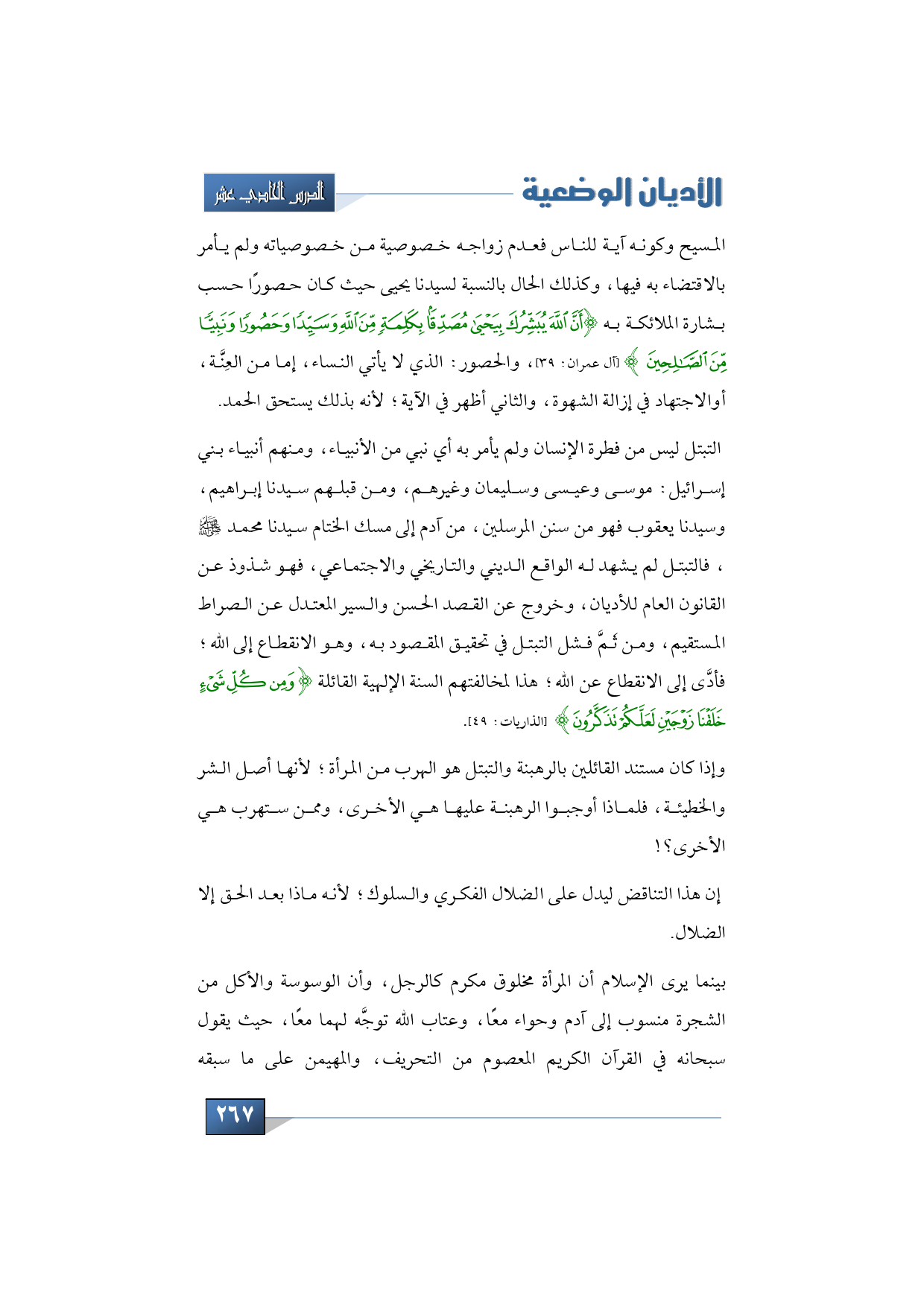 المسيح وكونه آية للناس فعدم زواجه خصوصية من خصوصياته ولم يأمر بالاقتضاء به فيها، وكذلك الحال بالنسبة لسيدنا يحيى حيث كان حصورًا حسب بشارة الملائكة به {أَنَّ اللَّهَ يُبَشِّرُكَ بِيَحْيَى مُصَدِّقًا بِكَلِمَةٍ مِنَ اللَّهِ وَسَيِّدًا وَحَصُورًا وَنَبِيًّا مِنَ الصَّالِحِينَ} (آل عمران: 39)، والحصور: الذي لا يأتي النساء، إما من العِنَّة والاجتهاد في إزالة الشهوة، والثاني أظهر في الآية؛ لأنه بذلك يستحق الرجل الحمد.
