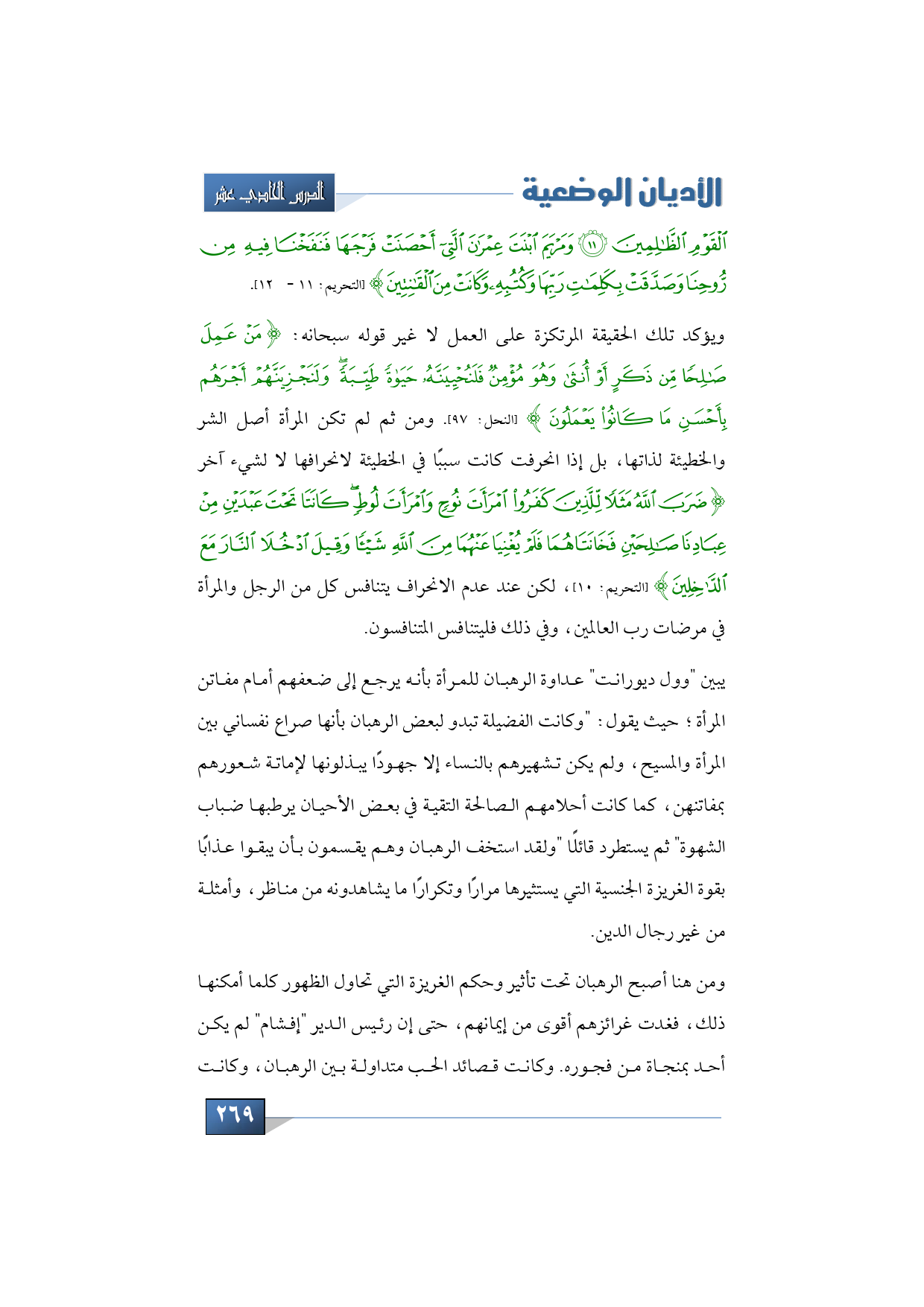 الْقَوْمِ الظَّالِمِينَ * وَمَرْيَمَ ابْنَتَ عِمْرَانَ الَّتِي أَحْصَنَتْ فَرْجَهَا فَنَفَخْنَا فِيهِ مِنْ رُوحِنَا وَصَدَّقَتْ بِكَلِمَاتِ رَبِّهَا وَكُتُبِهِ وَكَانَتْ مِنَ الْقَانِتِينَ} (التحريم: 11 - 12).