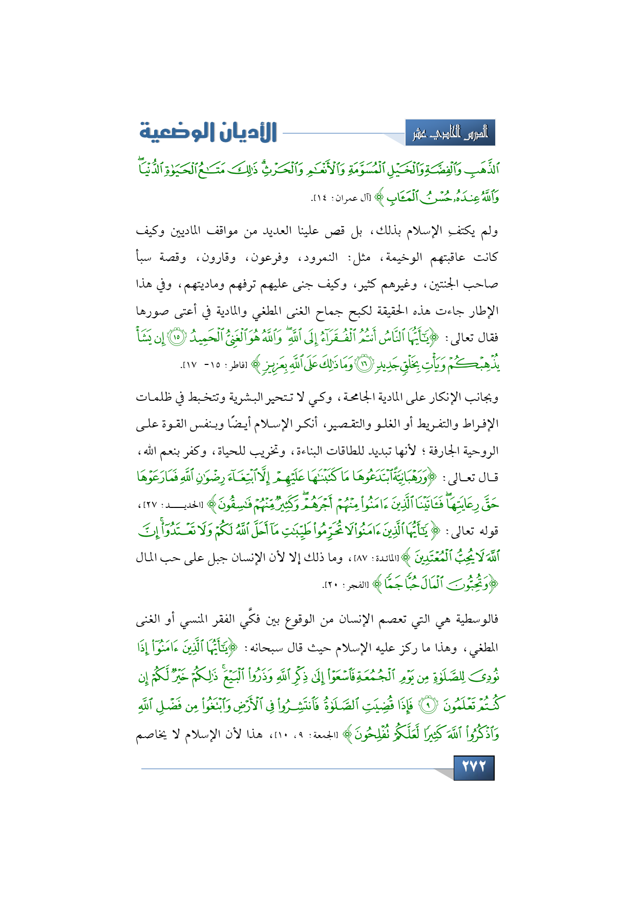 فالوسطية هي التي تعصم الإنسان من الوقوع بين فكَّي الفقر المنسي أو الغنى المطغي، وهذا ما ركز عليه الإسلام حيث قال سبحانه: {يَا أَيُّهَا الَّذِينَ آمَنُوا إِذَا نُودِيَ لِلصَّلَاةِ مِنْ يَوْمِ الْجُمُعَةِ فَاسْعَوْا إِلَى ذِكْرِ اللَّهِ وَذَرُوا الْبَيْعَ ذَلِكُمْ خَيْرٌ لَكُمْ إِنْ كُنْتُمْ تَعْلَمُونَ * فَإِذَا قُضِيَتِ الصَّلَاةُ فَانْتَشِرُوا فِي الْأَرْضِ وَابْتَغُوا مِنْ فَضْلِ اللَّهِ وَاذْكُرُوا اللَّهَ كَثِيرًا لَعَلَّكُمْ تُفْلِحُونَ} (الجمعة: 9، 10)، هذا لأن الإسلام لا يخاصم
