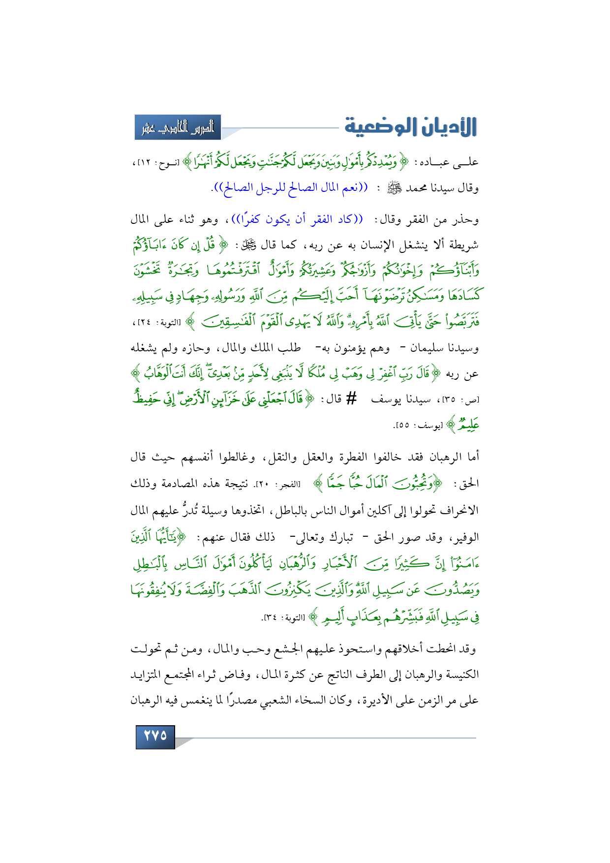 وحذر من الفقر وقال: ((كاد الفقر أن يكون كفرًا))، وهو ثناء على المال شريطة ألا ينشغل الإنسان به عن ربه، كما قال -عز وجل: {قُلْ إِنْ كَانَ آبَاؤُكُمْ وَأَبْنَاؤُكُمْ وَإِخْوَانُكُمْ وَأَزْوَاجُكُمْ وَعَشِيرَتُكُمْ وَأَمْوَالٌ اقْتَرَفْتُمُوهَا وَتِجَارَةٌ تَخْشَوْنَ كَسَادَهَا وَمَسَاكِنُ تَرْضَوْنَهَا أَحَبَّ إِلَيْكُمْ مِنَ اللَّهِ وَرَسُولِهِ وَجِهَادٍ فِي سَبِيلِهِ فَتَرَبَّصُوا حَتَّى يَأْتِيَ اللَّهُ بِأَمْرِهِ وَاللَّهُ لَا يَهْدِي الْقَوْمَ الْفَاسِقِينَ} (التوبة: 24)، وسيدنا سليمان -وهم يؤمنون به- طلب الملك والمال، وحازه ولم يشغله عن ربه {قَالَ رَبِّ اغْفِرْ لِي وَهَبْ لِي مُلْكًا لَا يَنْبَغِي لِأَحَدٍ مِنْ بَعْدِي إِنَّكَ أَنْتَ الْوَهَّابُ} (ص: 35)، سيدنا يوسف -عليه السلام- قال: {قَالَ اجْعَلْنِي عَلَى خَزَائِنِ الْأَرْضِ إِنِّي حَفِيظٌ عَلِيمٌ} (يوسف: 55).