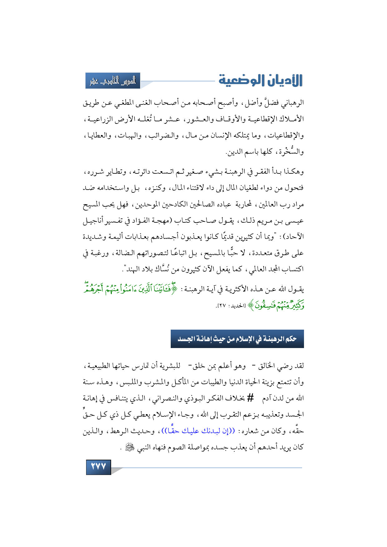 ثالثًا: إهانة الجسد، ومواصلة تعذيبه كأساس للرهبانية في ميزان الدين والعقل، لقد رضي الخالق -وهو أعلم بمن خلق- للبشرية أن تمارس حياتها الطبيعية، وأن تتمتع بزينة الحياة الدنيا والطيبات من المأكل والمشرب والملبس، وهذه سنة الله من لدن آدم -عليه السلام، بخلاف الفكر البوذي والنصراني، الذي يتنافس في إهانة الجسد وتعذيبه بزعم التقرب إلى الله، كما أسلفنا أثناء عرض أسس الرهبنة، وجاء الإسلام يعطي كل ذي كل حقٍّ حقَّه، وكان من شعاره: ((إن لبدنك عليك حقًّا))، وحديث الرهط، والذين كان يريد أحدهم أن يعذب جسده بمواصلة الصوم فنهاه النبي -صلى الله عليه وآله وسلم.
