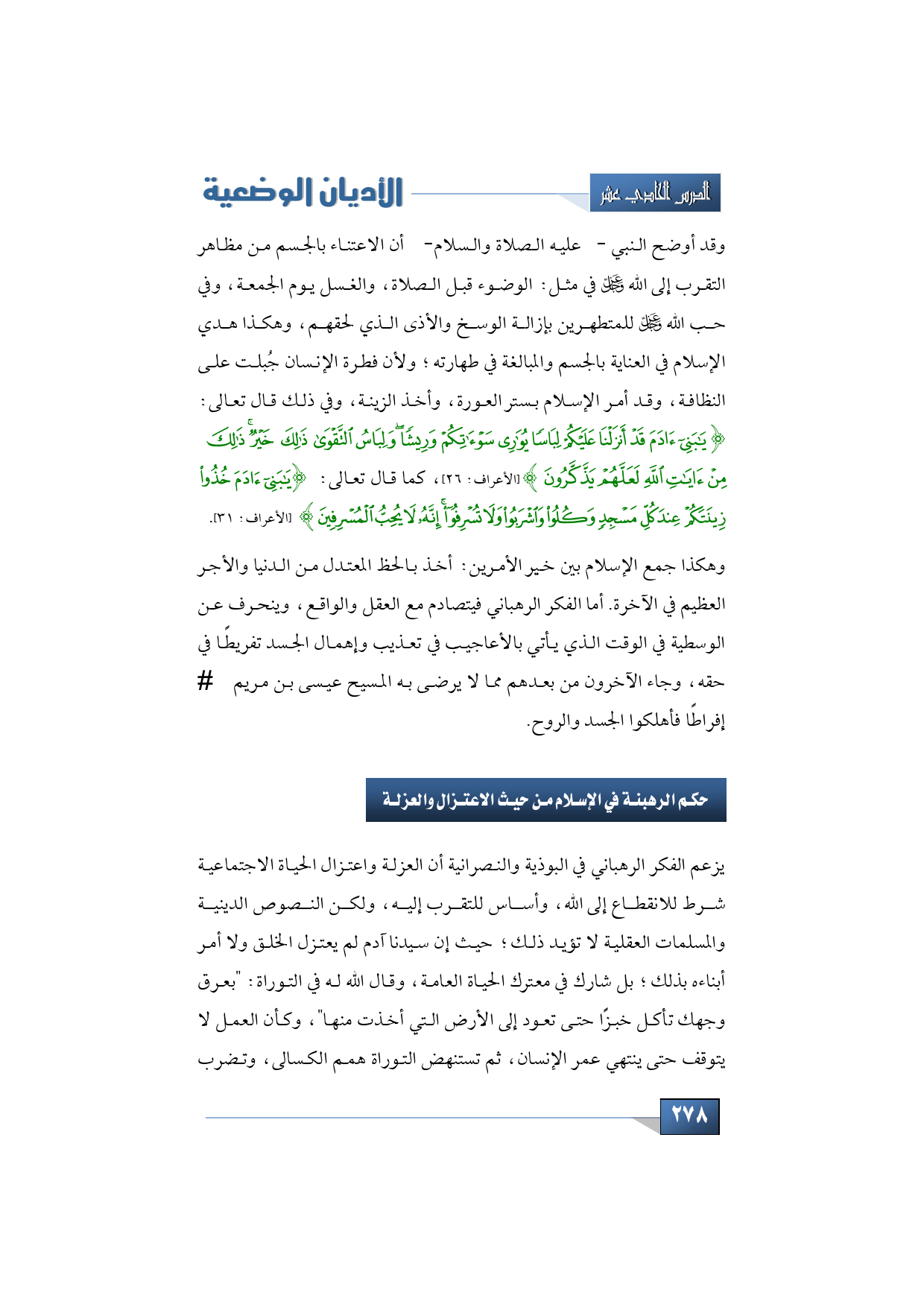 وقد أوضح النبي -عليه الصلاة والسلام- أن الاعتناء بالجسم من مظاهر التقرب إلى الله -عز وجل- في مثل: الوضوء قبل الصلاة، والغسل يوم الجمعة، وفي حب الله -عز وجل- للمتطهرين بإزالة الوسخ والأذى الذي لحقهم، وهكذا هدي الإسلام في العناية بالجسم والمبالغة في طهارته؛ ولأن فطرة الإنسان جُبلت على النظافة، وقد أمر الإسلام بستر العورة، وأخذ الزينة، وفي ذلك قال تعالى: {يَا بَنِي آدَمَ قَدْ أَنْزَلْنَا عَلَيْكُمْ لِبَاسًا يُوَارِي سَوْآتِكُمْ وَرِيشًا وَلِبَاسُ التَّقْوَى ذَلِكَ خَيْرٌ ذَلِكَ مِنْ آيَاتِ اللَّهِ لَعَلَّهُمْ يَذَّكَّرُونَ} (الأعراف: 26)، كما قال تعالى: {يَا بَنِي آدَمَ خُذُوا زِينَتَكُمْ عِنْدَ كُلِّ مَسْجِدٍ وَكُلُوا وَاشْرَبُوا وَلَا تُسْرِفُوا إِنَّهُ لَا يُحِبُّ الْمُسْرِفِينَ} (الأعراف: 31).