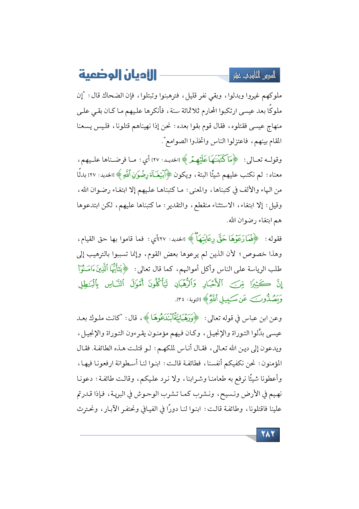 فقوله: {فَمَا رَعَوْهَا حَقَّ رِعَايَتِهَا} (الحديد: 27) أي: فما قاموا بها حق القيام، وهذا خصوص؛ لأن الذين لم يرعوها بعض القوم، وإنما تسببوا بالترهيب إلى طلب الرياسة على الناس وأكل أموالهم، كما قال تعالى: {يَا أَيُّهَا الَّذِينَ آمَنُوا إِنَّ كَثِيرًا مِنَ الْأَحْبَارِ وَالرُّهْبَانِ لَيَأْكُلُونَ أَمْوَالَ النَّاسِ بِالْبَاطِلِ وَيَصُدُّونَ عَنْ سَبِيلِ اللَّهِ} (التوبة: 34).