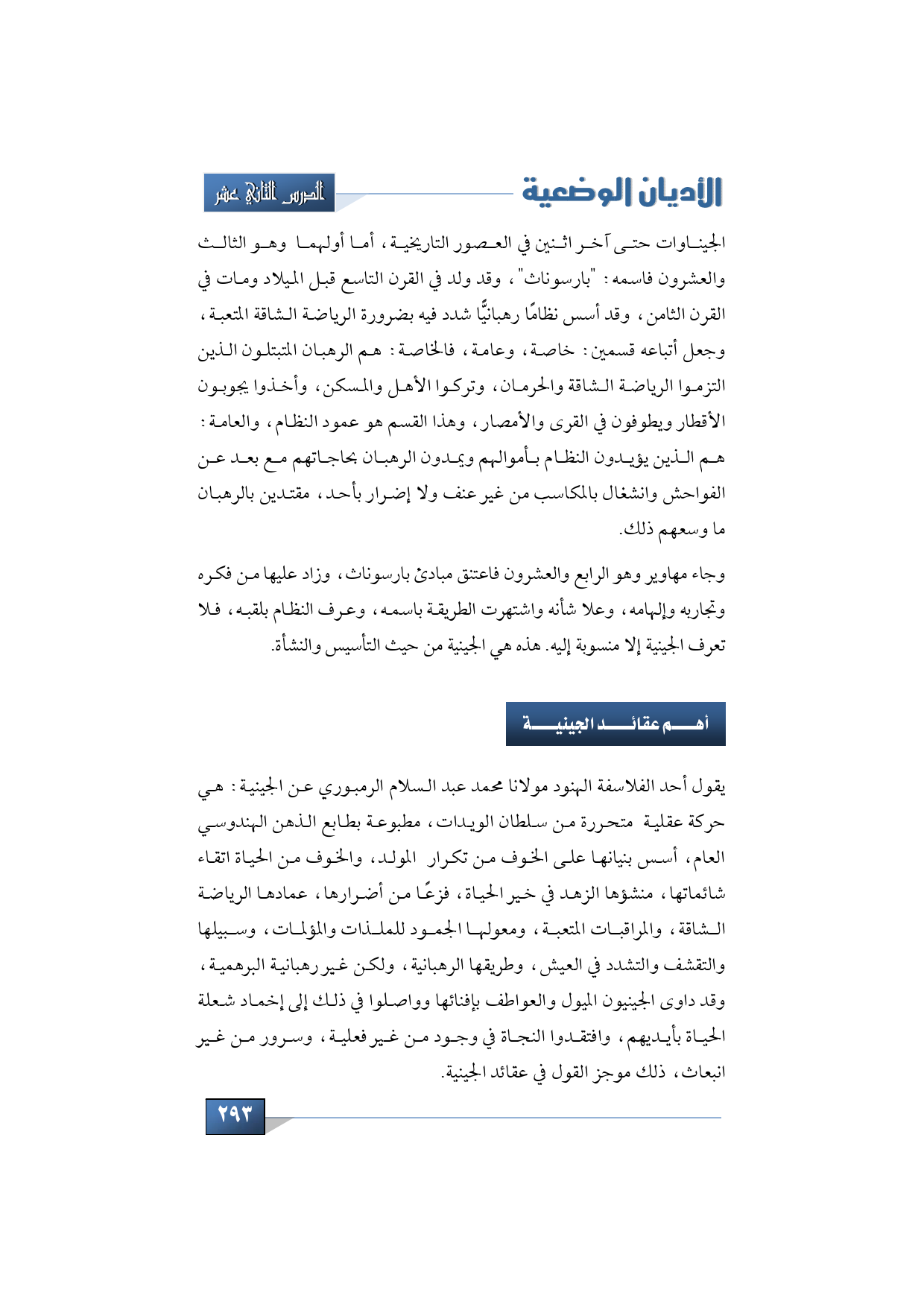 الجيناوات الواحد بعد الآخر حتى ظهر الجيناواني الآخران في العصور التاريخية، أما أولهما وهو جين الثالث والعشرون فاسمه بارسوناث، وقد ولد في القرن التاسع قبل الميلاد ومات في القرن الثامن، وقد أسس نظامًا رهبانيًّا شدد فيه بضرورة الرياضيات الشاقة المتعبة، وجعل أتباعه قسمين: خاصة، وعامة، فالخاصة هم الرهبان المتبتلون الذين التزموا الرياضة الشاقة والحرمان، وتركوا الأهل والمسكن، وأخذوا يجوبون الأقطار ويطوفون في القرى والأمصار، وهذا القسم هو عمود النظام، والعامة هم الذين يؤيدون النظام بأموالهم ويمدون الرهبان بحاجاتهم مع بعد عن الفواحش وانشغال بالمكاسب من غير عنف ولا إضرار بأحد، مقتدين بالرهبان ما وسعهم ذلك.