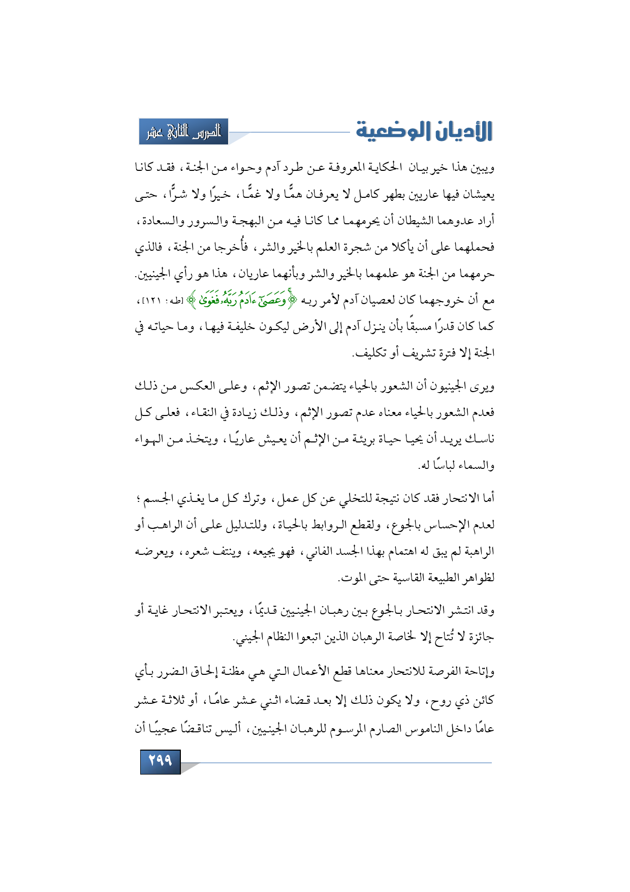 ويبين هذا خير بيان الحكاية المعروفة عن طرد آدم وحواء من الجنة، فقد كانا يعيشان فيها عاريين بطهر كامل لا يعرفان همًّا ولا غمًّا، خيرًا ولا شرًّا، حتى أراد عدوهما الشيطان أن يحرمهما مما كانا فيه من البهجة والسرور والسعادة، فحملهما على أن يأكلا من شجرة العلم بالخير والشر، فأُخرجا من الجنة، فالذي حرمهما من الجنة هو علمهما بالخير والشر وبأنهما عاريان، هذا هو رأي الجينيين ونحن نرى أن خروجهما كان لعصيان آدم لأمر ربه {وَعَصَى آدَمُ رَبَّهُ فَغَوَى} (طه: 121)، كما كان قدرًا مسبقًا بأن ينزل آدم إلى الأرض ليكون خليفة فيها، وما حياته في الجنة إلا فترة تشريف أو تكليف.