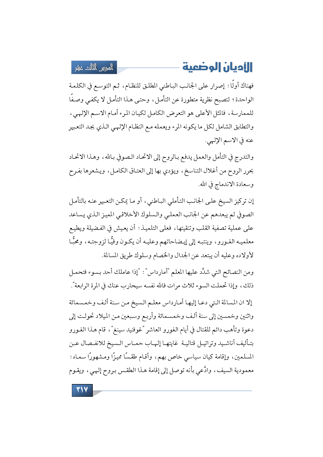 فهناك أولًا إصرار على الجانب الباطني المطلق للنظام، ثم التوسع في الكلمة الواحدة؛ لتصبح نظرية متطورة عن التأمل، وحتى هذا التأمل لا يكفي وصفًا للممارسة، فالمثل الأعلى هو التعرض الكامل لكيان المرء أمام الاسم الإلهي، والتطابق الشامل لكل ما يكونه المرء ويعمله مع النظام الإلهي الذي يجد التعبير عنه في الاسم الإلهي.