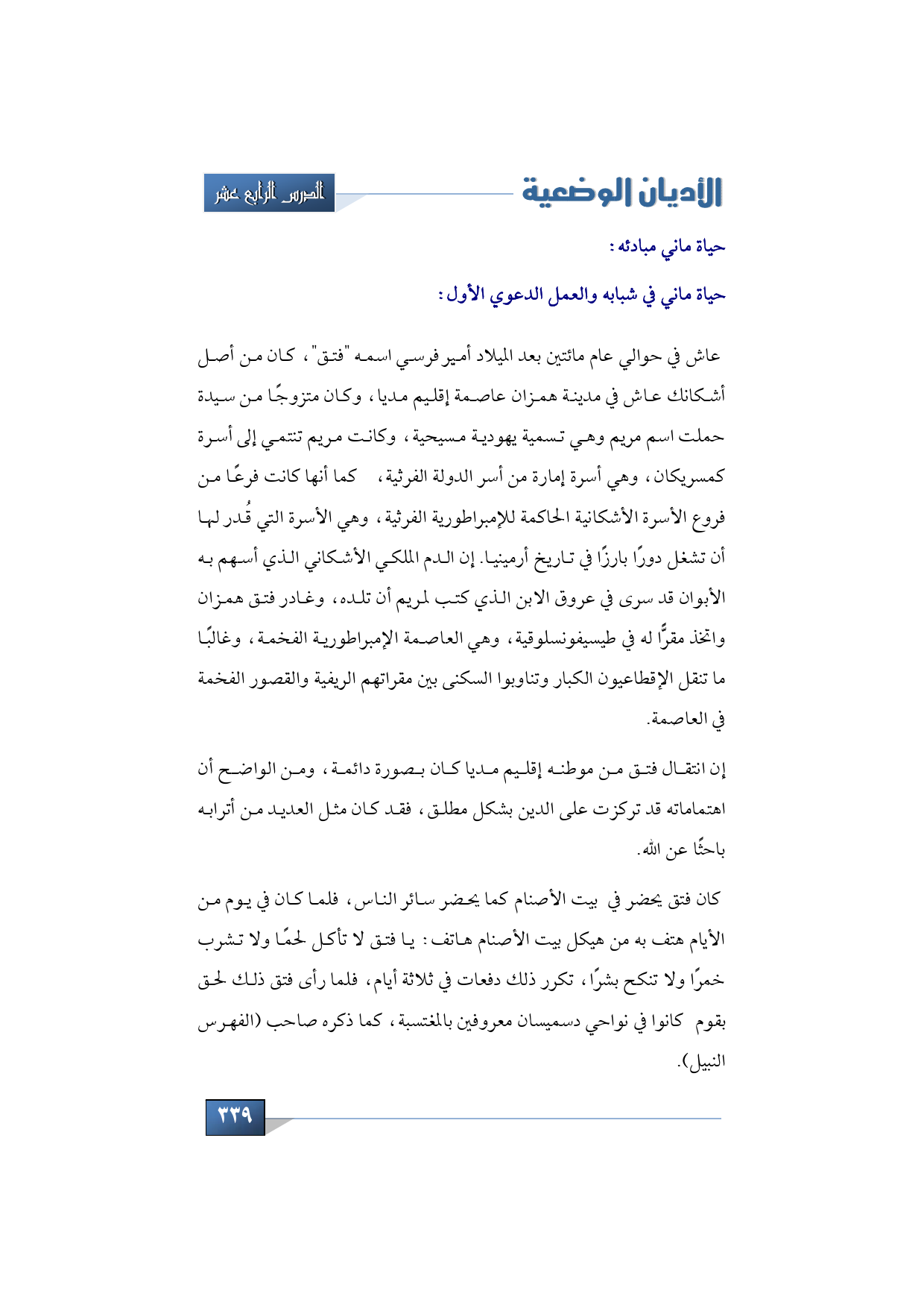 بعد هذه المقدمة التمهيدية والفكرة السريعة حول الديانة المانوية نشرع في ترجمة ماني وحياته وذكر مبادئه إن شاء الله تعالى.