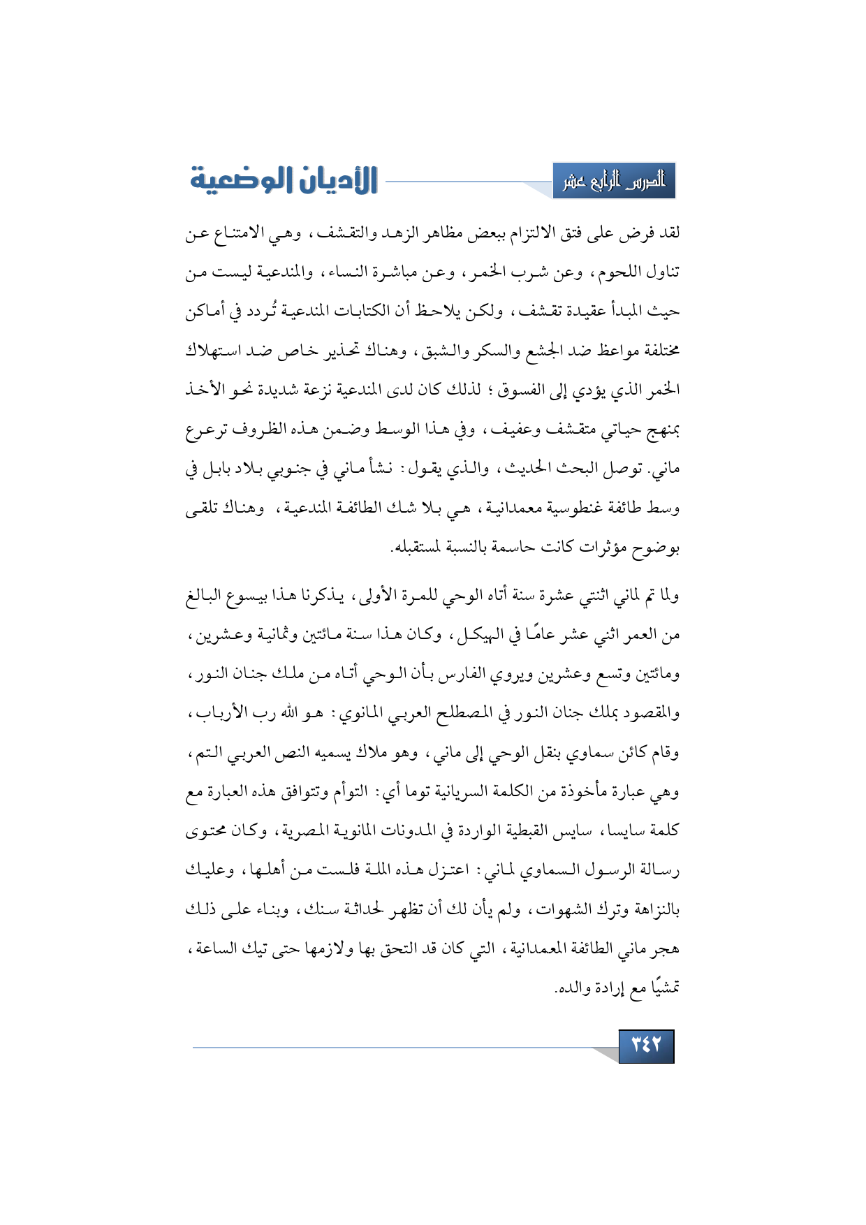لقد فرض على فتق الإلتزام ببعض مظاهر الزهد والتقشف، وهي الامتناع عن تناول اللحوم، وعن شرب الخمر، وعن مباشرة النساء، والمندعية كما هو معلوم ليست من حيث المبدأ عقيدة تقشف، ولكن يلاحظ ان الكتابات المندعية تُردد في أماكن مختلفة مواعظ ضد الجشع والسكر والشبق، وهناك تحذير خاص ضد استهلاك الخمر الذي يؤدي إلى الفسوق؛ لذلك من الواضح أنه كان لدى المندعية نزعة شديدة نحو الأخذ بمنهج حياتي متقشف وعفيف، وفي هذا الوسط وضمن هذه الظروف ترعرع ماني، ولذلك فإن استنتاجنا هو الاستنتاج نفسه الذي توصل إليه البحث الحديث، والذي يقول: نشأ ماني في جنوبي بلاد بابل في وسط طائفة غنطوسية معمدانية، هي بلا شك الطائفة المندعية، وهناك تلقى بوضوح مؤثرات كانت حاسمة بالنسبة لمستقبله.
