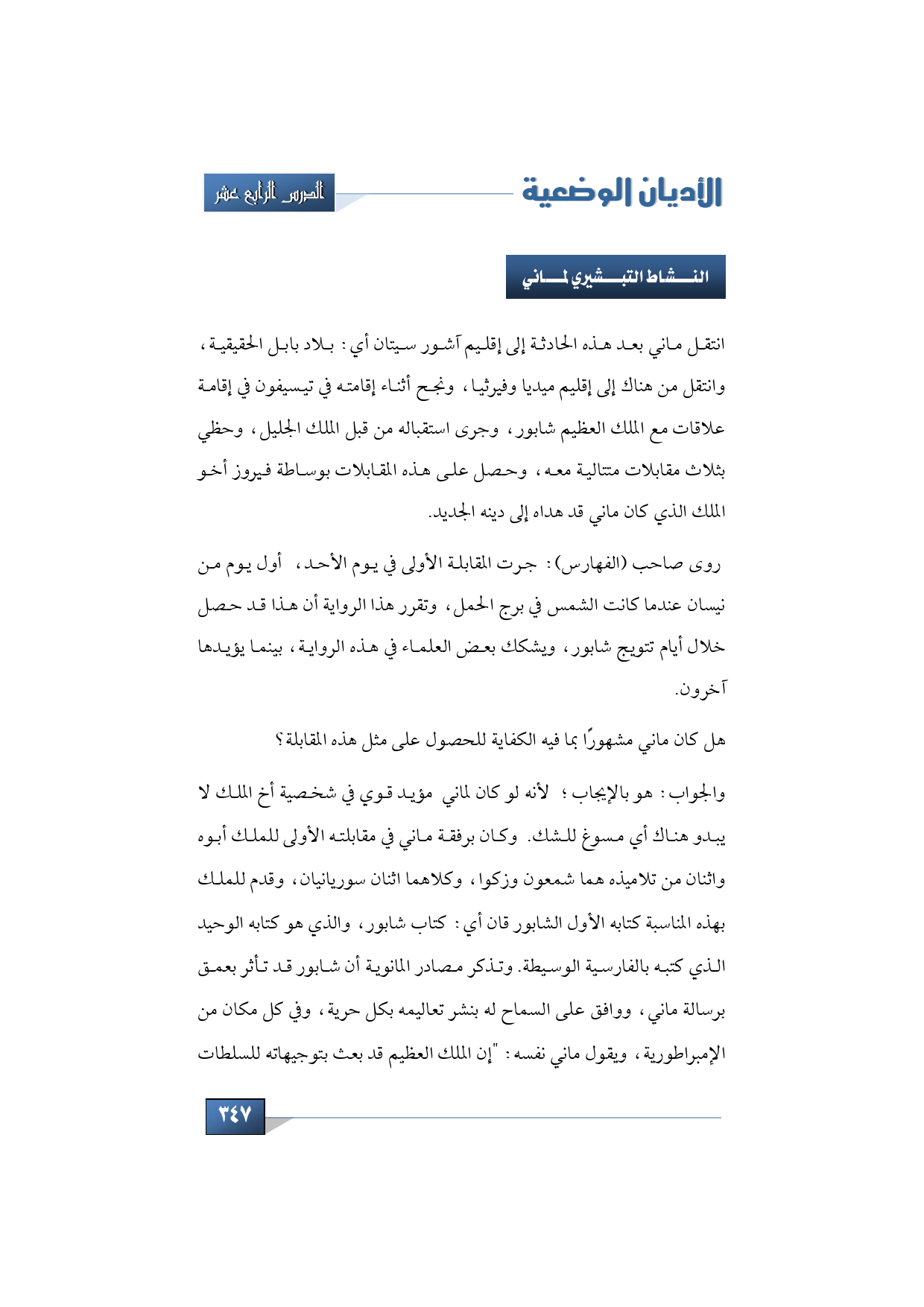 انتقل ماني بعد هذه الحادثة إلى إقليم آشور سيتان أي: بلاد بابل الحقيقية، وانتقل من هناك إلى إقليم ميديا وفيرثيا، ونجح أثناء إقامته في تيسيفون في إقامة علاقات مع الملك العظيم شابور، وجرى استقباله من قبل الملك الجليل، وحظي بثلاث مقابلات متتالية معه، وحصل على هذه المقابلات بوساطة فيروز أخو الملك الذي كان ماني قد هداه إلى دينه الجديد أيضًا، وتبعًا لسيرة ماني كما رواه صاحب (الفهارس) جرت المقابلة الأولى في يوم الأحد، أول يوم من نيسان عندما كانت الشمس في برج الحمل، وتقرر هذا الرواية أن هذا قد حصل خلال أيام تتويج شابور، ويشكك بعض العلماء في أيامنا هذه في هذه المسألة، بينما يؤيدها آخرون ويواجهنا هنا سؤال هو هل كان ماني مشهورًا بما فيه الكفاية للحصول على مثل هذه المقابلة؟