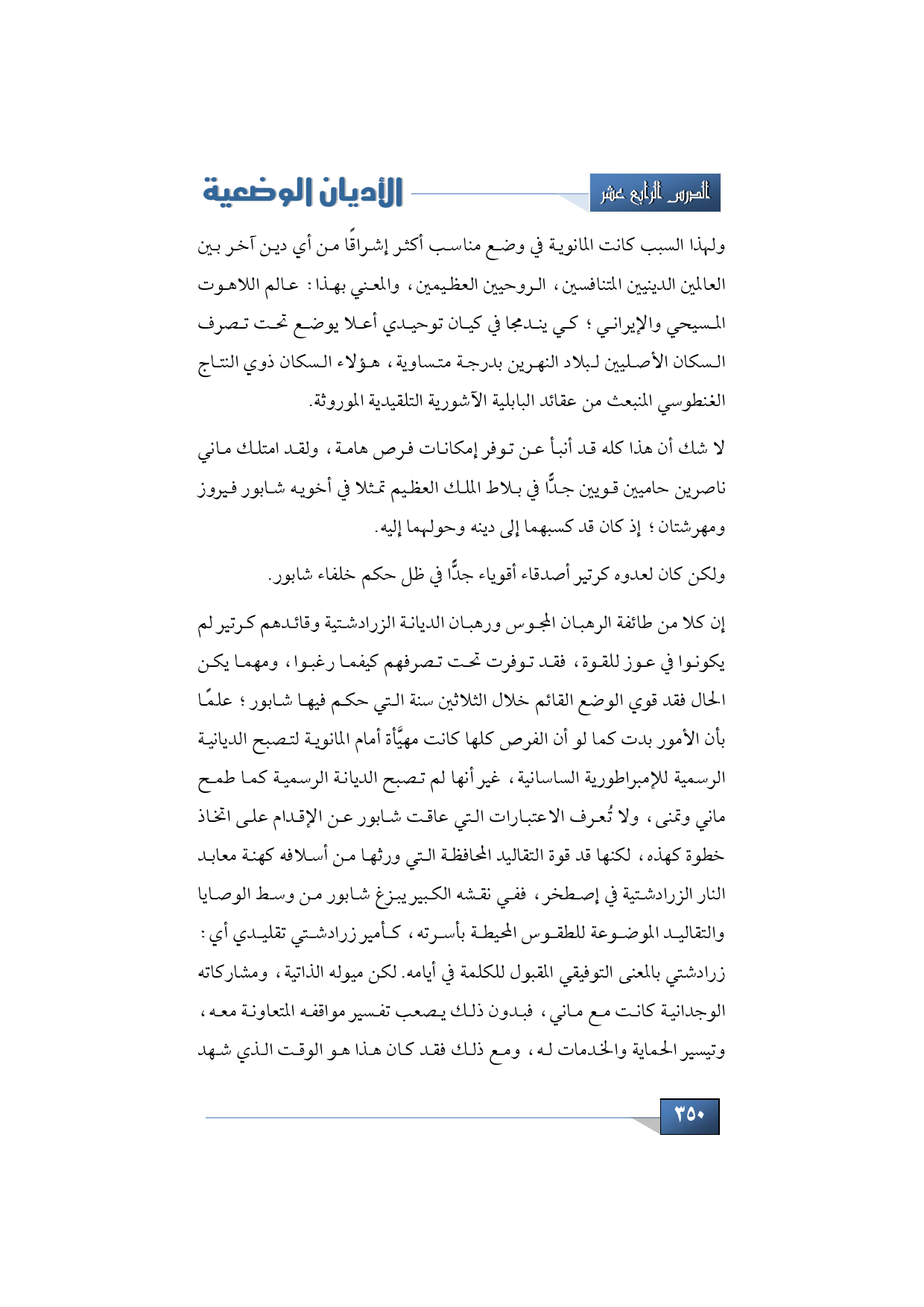 ومن جانب مقابل كان لعدوه كرتير أصدقاء أقوياء جدًّا في ظل حكم خلفاء شابور، وذلك على الرغم من أننا لا نعرف من الذي أيده خلال فترة حكم شابور، هذا، وبإمكاننا أن نستخلص اعتمادًا على ما نعرفه عن الفئات والتجمعات التي ازدهر نشاطها في البلاط أن كلًّا من طائفة الرهبان المجوس ورهبان الديانة الزرادشتية وقائدهم كرتير لم يكونوا في عوز للقوة، فقد توفرت تحت تصرفهم كيفما رغبوا، ومهما يكن الحال فقد قوي الوضع القائم، وتمتنُّ خلال الثلاثين سنة التي حكم فيها شابور؛ علمًا بأن الأمور بدت كما لو أن الفرص كلها كانت مهيَّأة أمام المانوية لتصبح الديانية الرسمية للإمبراطورية الساسانية، غير أنها لم تصبح الديانة الرسمية كما طمح ماني وتمنى، ولا نعرف الاعتبارات التي عاقت شابور عن الإقدام على اتخاذ خطوة كهذه، لكننا نستطيع بكل ثقة أن نقدر حق القدر قوة التقاليد المحافظة التي ورثها من أسلافه كهنة معابد النار الزرادشتية في إصطخر، ففي نقشه الكبير يبزغ شابور من وسط الوصايا والتقاليد الموضوعة للطقوس المحيطة بأسرته، كأمير زرادشتي تقليدي أي: زرادشتي بالمعنى التوفيقي المقبول للكلمة في أيامه.