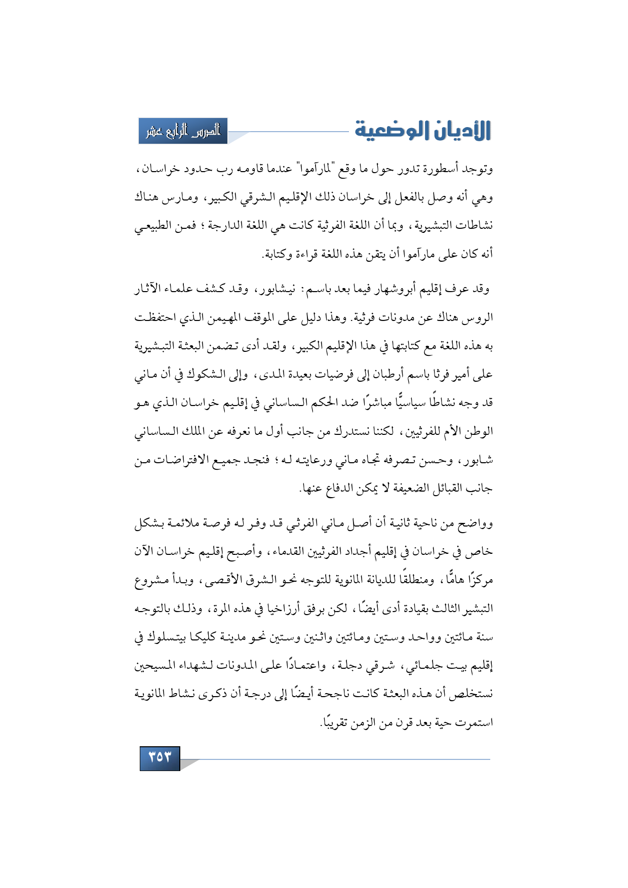 وقد عرف إقليم أبروشهار فيما بعد باسم نيشابور، وقد كشف علماء الآثار الروس هناك عن مدونات فرثية. وهذا دليل على الموقف المهيمن الذي احتفظت به هذه اللغة مع كتابتها في هذا الإقليم الكبير، ولقد أدى تضمن البعثة التبشيرية على أمير فرثا باسم أرطبان إلى فرضيات بعيدة المدى، وإلى الشكوك في أن ماني قد وجه نشاطًا سياسيًّا مباشرًا ضد الحكم الساساني في إقليم خراسان الذي هو الوطن الأم للفرثيين، لكننا نستدرك من جانب أول ما نعرفه عن الملك الساساني شابور، وحسن تصرفه تجاه ماني ورعايته له؛ فنجد جميع الافتراضات من جانب القبائل الضعيفة لا يمكن الدفاع عنها.