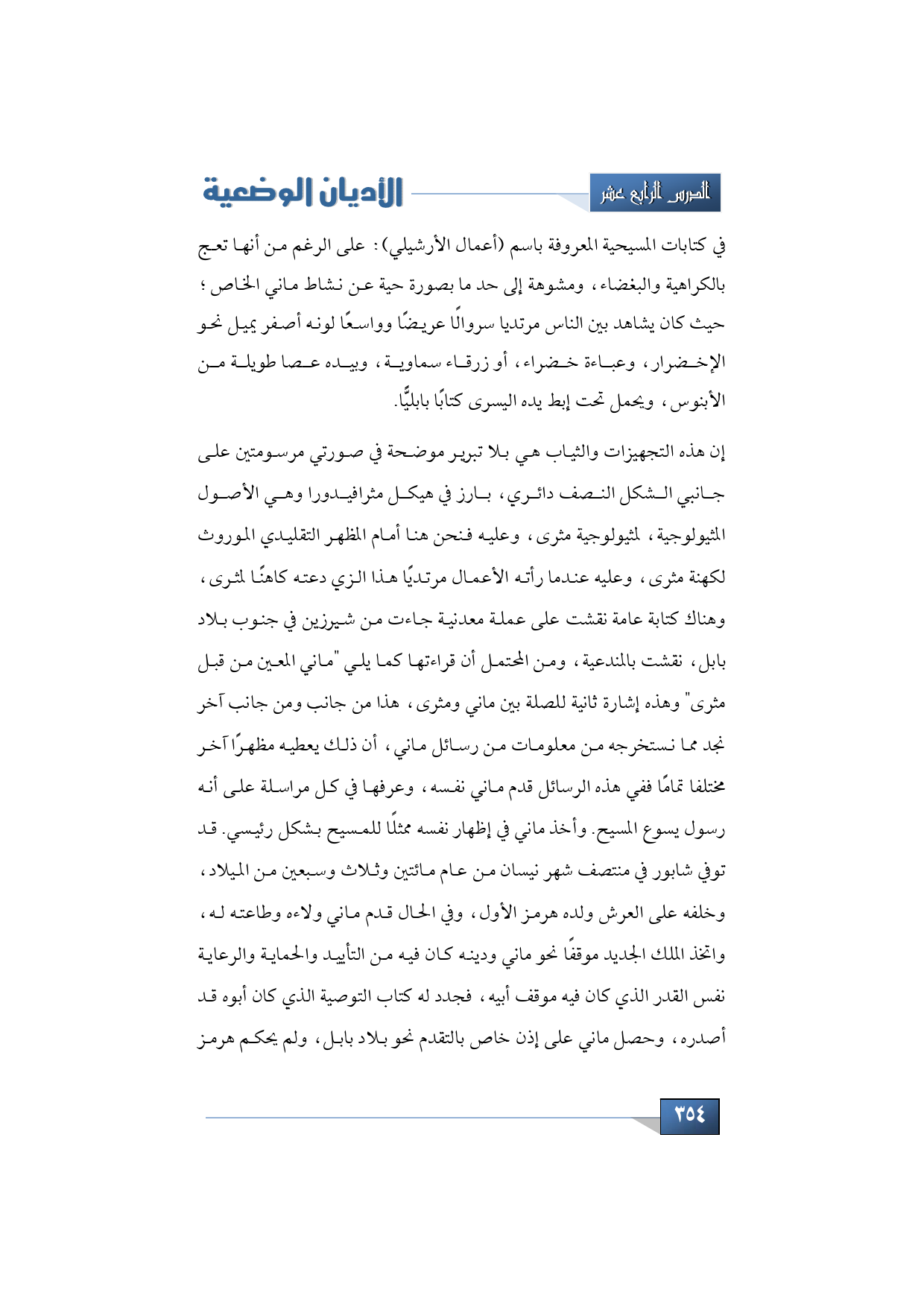 وتزودنا كتابات المسيحية المعروفة باسم أعمال الأرشيلي على الرغم من أنها تعج بالكراهية والبغضاء، ومشوهة إلى حد ما بصورة حية عن نشاط ماني الخاص؛ حيث كان يشاهد بين الناس مرتديا سروالًا عريضًا وواسعًا لونه أصفر يميل نحو الاخضرار، وعباءة خضراء، أو زرقاء سماوية، وبيده عصا طويلة من الأبنوس، ويحمل تحت إبط يده اليسرى كتابًا بابليًّا.