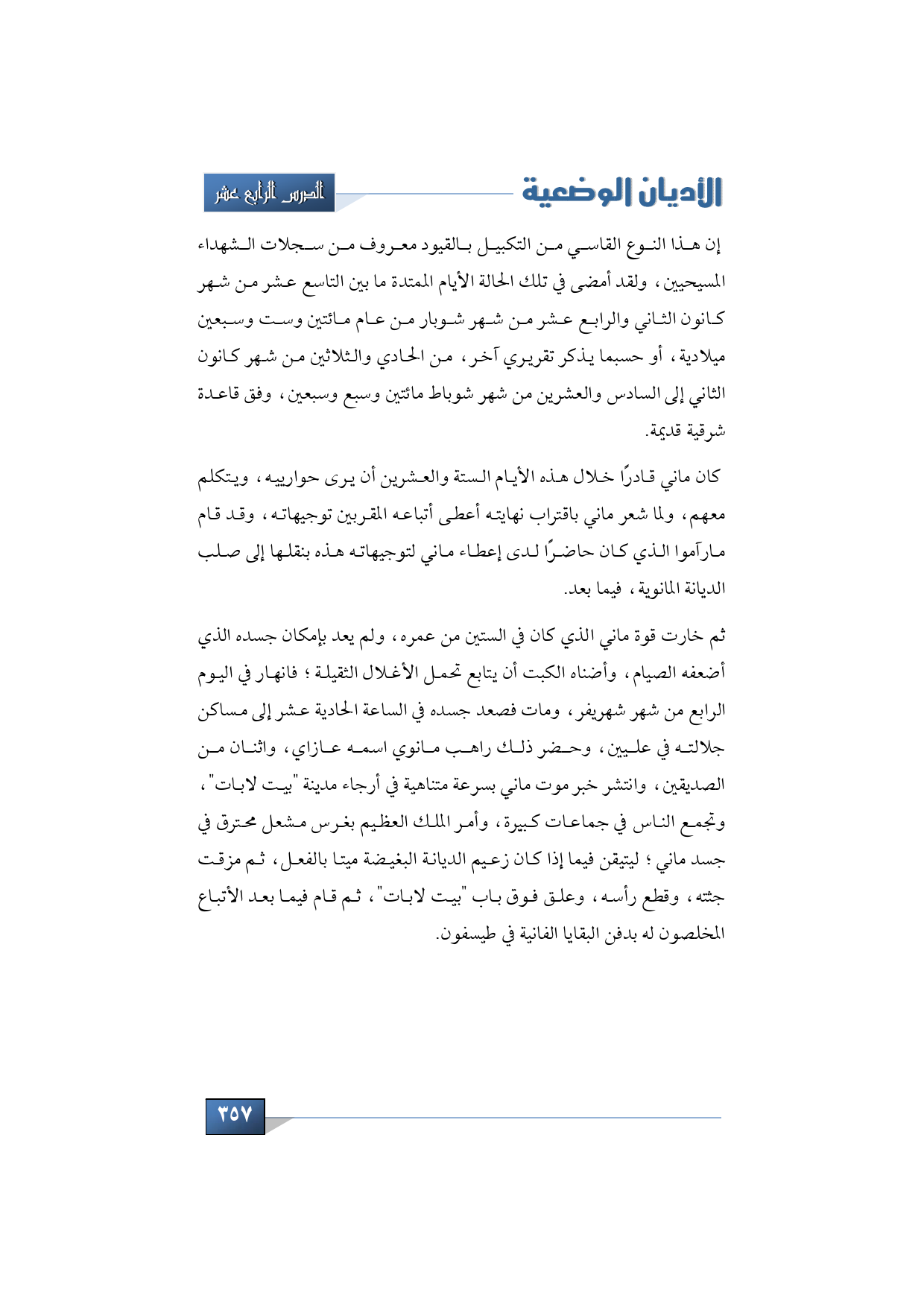 ثم خارت قوة ماني الذي كان في الستين من عمره، ولم يعد بإمكان جسده الذي أضعفه الصيام، وأضناه الكبت أن يتابع تحمل الأغلال الثقيلة؛ فانهار في اليوم الرابع من شهر شهريفر، ومات فصعد من جسده في الساعة الحادية عشر إلى مساكن جلالته في عليين، وحضر ذلك راهب مانوي اسمه عازاي، واثنان من الصديقين، وانتشر خبر موت ماني بسرعة متناهية في أرجاء مدينة بيت لابات، وتجمع الناس في جماعات كبيرة، وأمر الملك العظيم بغرس مشعل محترق في جسد ماني؛ ليتيقن فيما إذا كان زعيم الديانة البغيضة ميت بالفعل، ثم مزقت جثته، وقطع رأسه، وعلق فوق باب بيت لابات، ثم قام فيما بعد الأتباع المخلصون له بدفن البقايا الفانية في طيسفون.