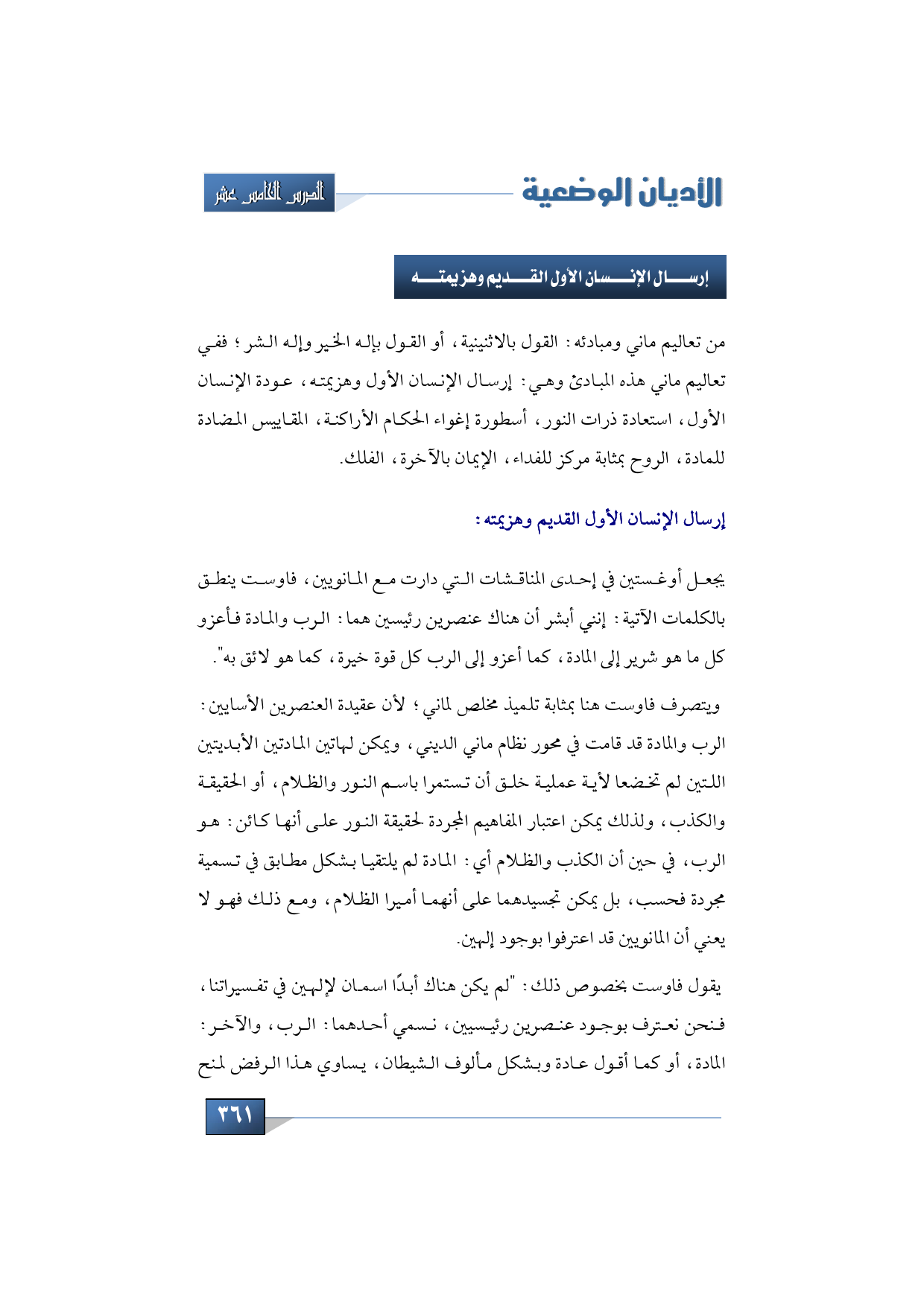 فتعال بنا الآن نتحدث عن تعاليم ماني ومبادئه والوصول إلى القول بالاثنينية، أو القول بإله الخير وإله الشر؛ فنجد في تعاليم ماني هذه المبادئ؛ إرسال الإنسان الأول وهزيمته، عودة الإنسان الأول، استعادة ذرات النور، أسطورة إغواء الحكام الأراكنة، المقاييس المضادة للمادة، الروح بمثابة مركز للفداء، الإيمان بالآخرة، الفلك.