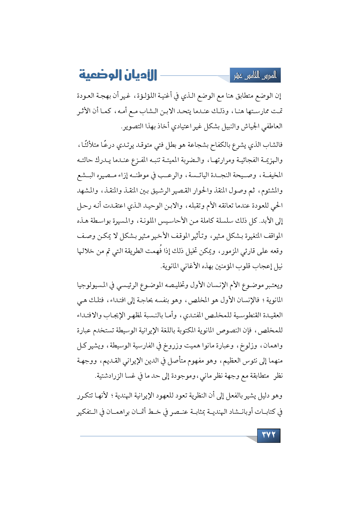 فالشاب الذي يشرع بالكفاح بشجاعة هو بطل فتى متوقد يرتدي درعًا متلألئًا، والهزيمة الفجائية ومرارتها، والضربة المميتة تنبه المفزع عندما يدرك حالته المخيفة وصيحة النجدة اليائسة والرعب في موطنه إزاء مصيره البشع والمشئوم، ثم وصول المنقذ والحوار القصير الرشيق بين المنقذ والمنقذ، والمشهد الحي للعودة عندما تعانقه الأم وتقبله، والابن الوحيد الذي اعتقدت أنه رحل إلى الأبد. كل ذلك سلسلة كاملة من الأحاسيس الملونة، والمسيرة بواسطة هذه المشاهد المتغيرة بشكل مثير، وتأثير المشهد الأخير مثير بشكل لا يمكن وصف وقعه على مستمعي المذمور، ويمكن تخيل ذلك إذا فهمت الطريقة التي تم من خلالها نيل إعجاب قلوب المؤمنين بهذه الأغاني المانوية.