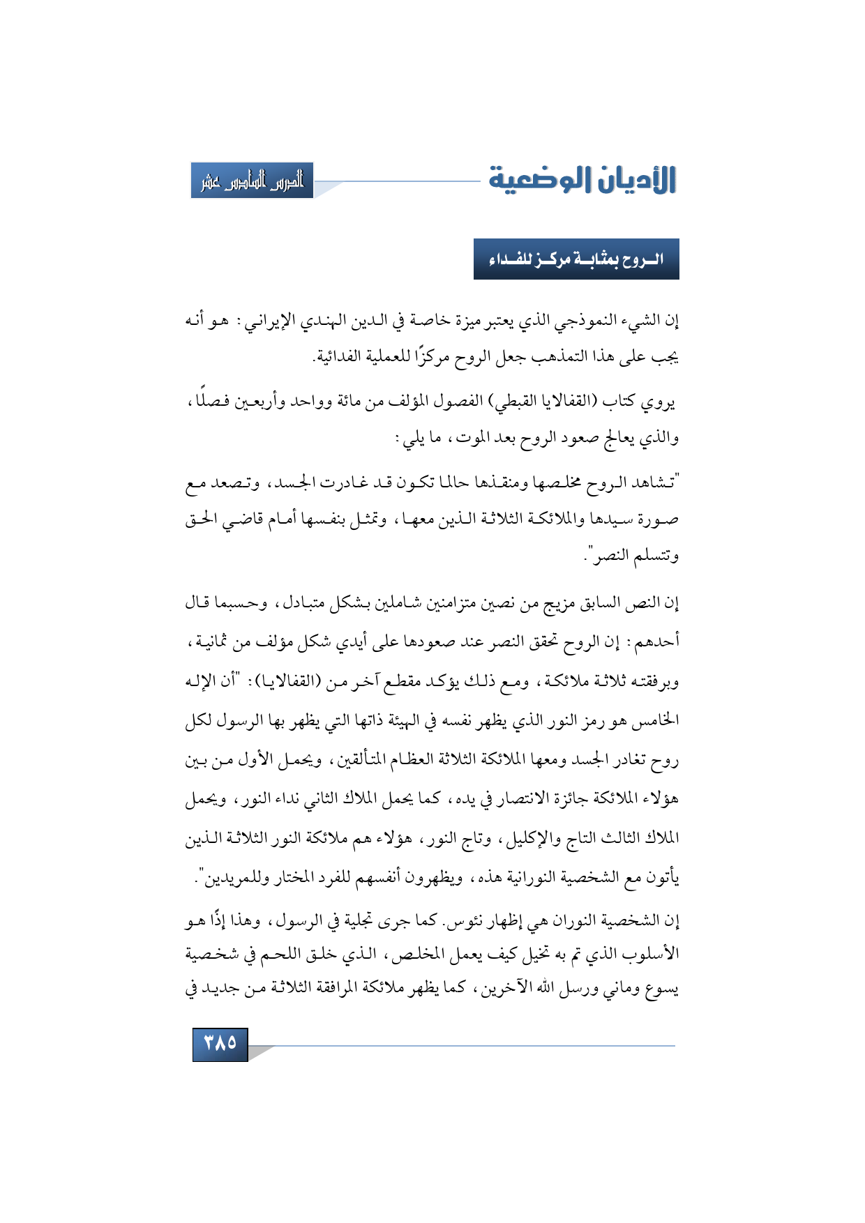 إن الشيء النموذجي الذي يعتبر ميزة خاصة في الدين الهندي الإيراني هو أنه يجب على هذا التمذهب جعل الروح مركزًا للعملية الفدائية، ويروي كتاب (القفالايا القبطي) الفصول المؤلف من مائة وإحدى وأربعين فصلًا، والذي يعالج صعود الروح بعد الموت، ما يلي: