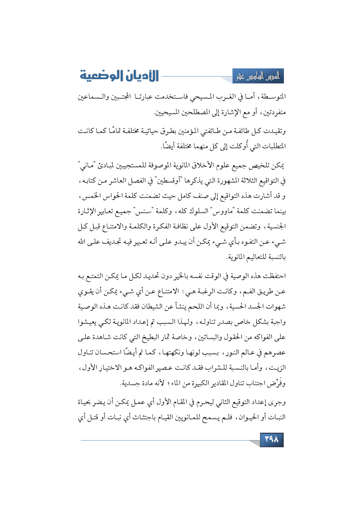 احتفظت هذه الوصية في الوقت نفسه بالخير دون تحديد لكل ما يمكن التمتع به عن طريق الفم، وكانت الرغبة هي الامتناع عن أي شيء يمكن أن يقوي شهوات الجسد الحسية، وبما أن اللحم ينشأ عن الشيطان فقد كانت هذه الوصية واجبة بشكل خاص بصدر تناوله، ولهذا السبب تم إعداد المانوية لكي يعيشوا على الفواكه من الحقول والبساتين، وخاصة ثمار البطيخ التي كانت شاهدة على عصرهم في عالم النور، بسبب لونها ونكهتها، كما تم أيضًا استحسان تناول الزيت، وأما بالنسبة للشراب فقد كانت عصير الفواكه هو الاختيار الأول، وفَرْض اجتناب تناول المقادير الكبيرة من الماء؛ لأنه مادة جسدية.